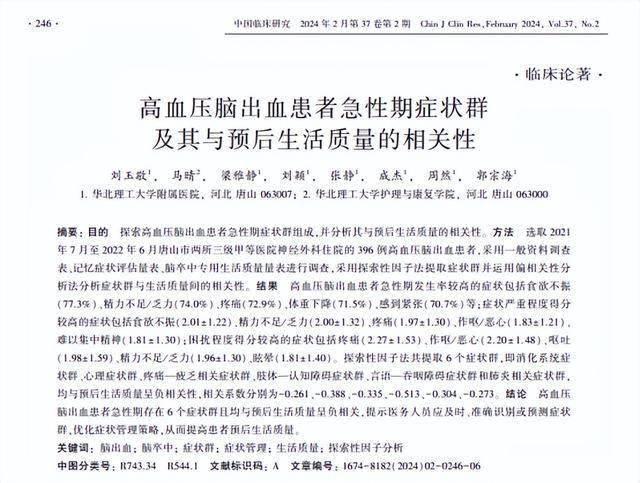 刘玉敬,马晴,梁雅静,刘颖,张静,成杰,周然,郭宗海,高血压脑出血患者急性期症状群及其与预后生活质量的相关性,中国临床研究,2024-02-20