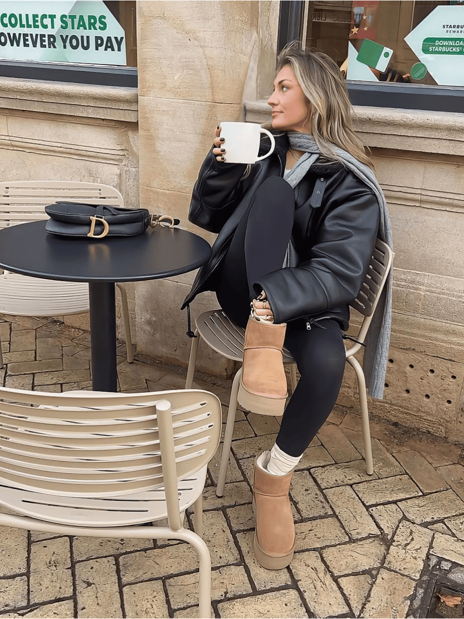怕冷不想露腿,或者觉得穿光腿神器有点假的女生,可以试试下装换成加绒瑜伽裤 or 鲨鱼裤,搭配 UGG 和袜套。