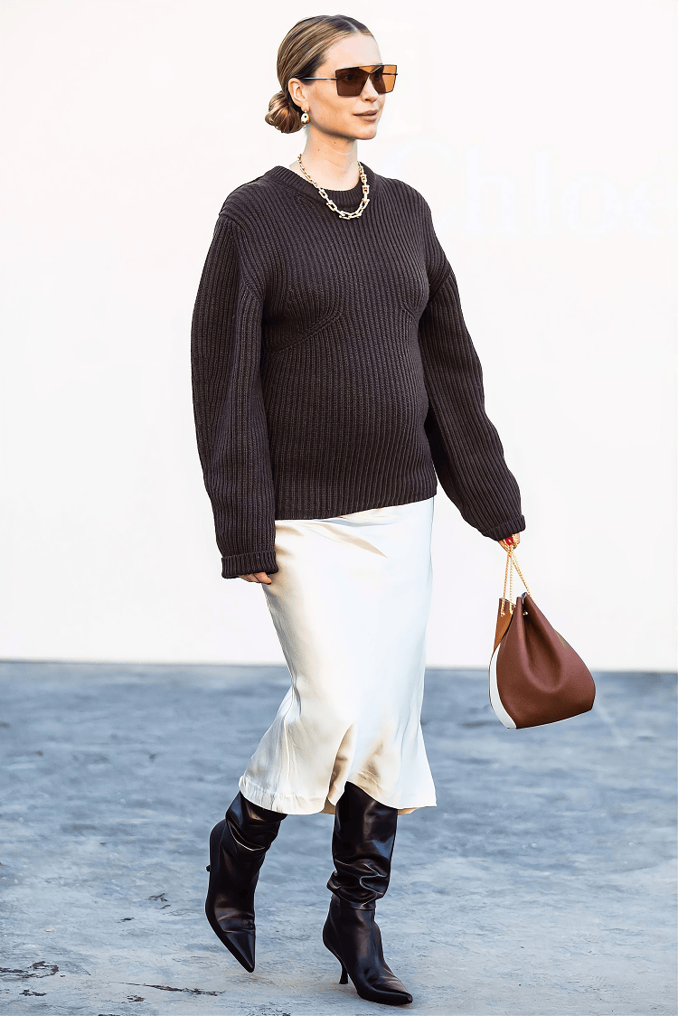 搭配中长裙时,要特别注意避免臃肿。可以选择裙摆有开衩设计的款式,让靴子在步履间若隐若现,增加时尚感。也可以让连衣裙/半身裙与靴筒形成流畅衔接,展现出优雅的气质。
