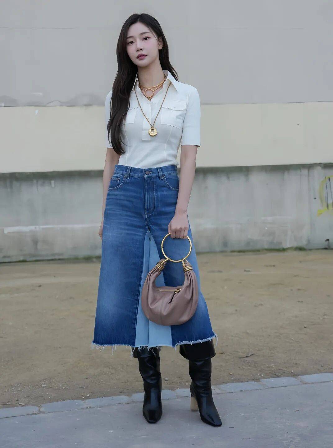尖头/成熟款:可以学Bella的“紧身牛仔裤+宽口靴”经典组合,不挑外套,轻松穿出静奢感;更进阶的是Jennie的“不对称穿法”——一边裤脚塞进靴筒,一边松弛地放出来盖住靴子,适合追求个性的时髦精。