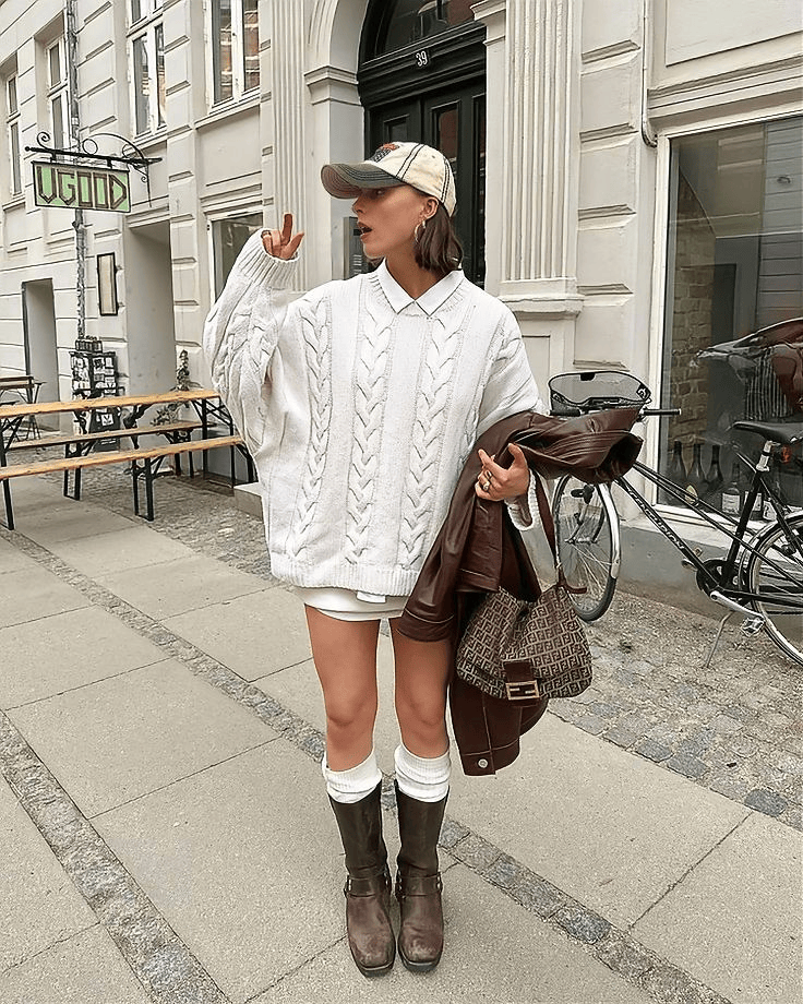 圆头、偏休闲气质的骑士靴和马靴,通过叠穿中筒袜可以提升时髦度。在靴口上方露出一截针织袜,能增加层次感,带来复古又青春的混搭效果。选择白色和灰色等百搭安全色,能避免长筒袜与靴子顺色而弱化层次感。这种搭法适配度很高,无论是学院风,还是搭配偏休闲的短裤、短裙或毛衣裙都十分合适。如果担心穿着冷,可以在里面加一条光腿神器,由于露腿度不高,也不用担心光腿神器显“假肉感”的问题。