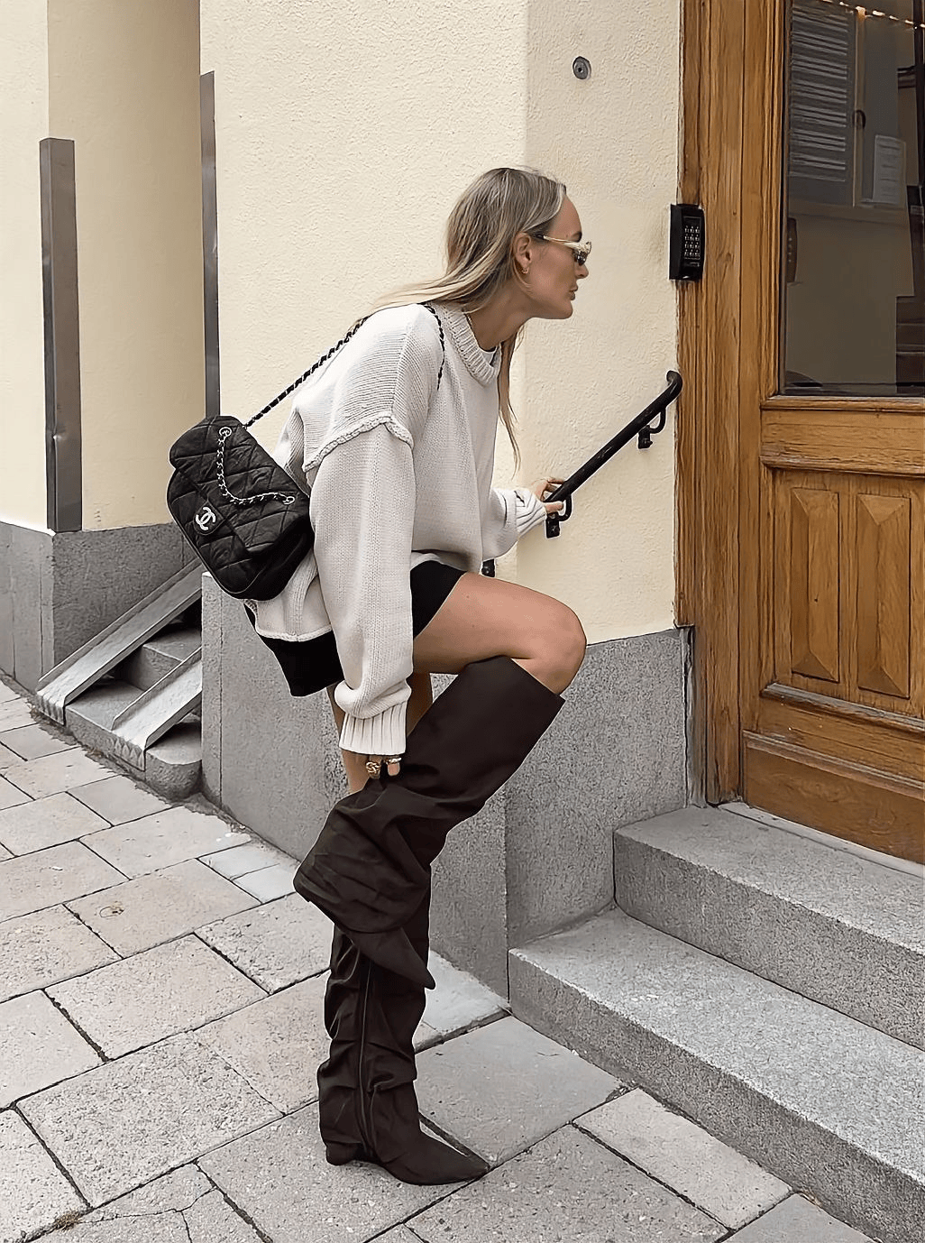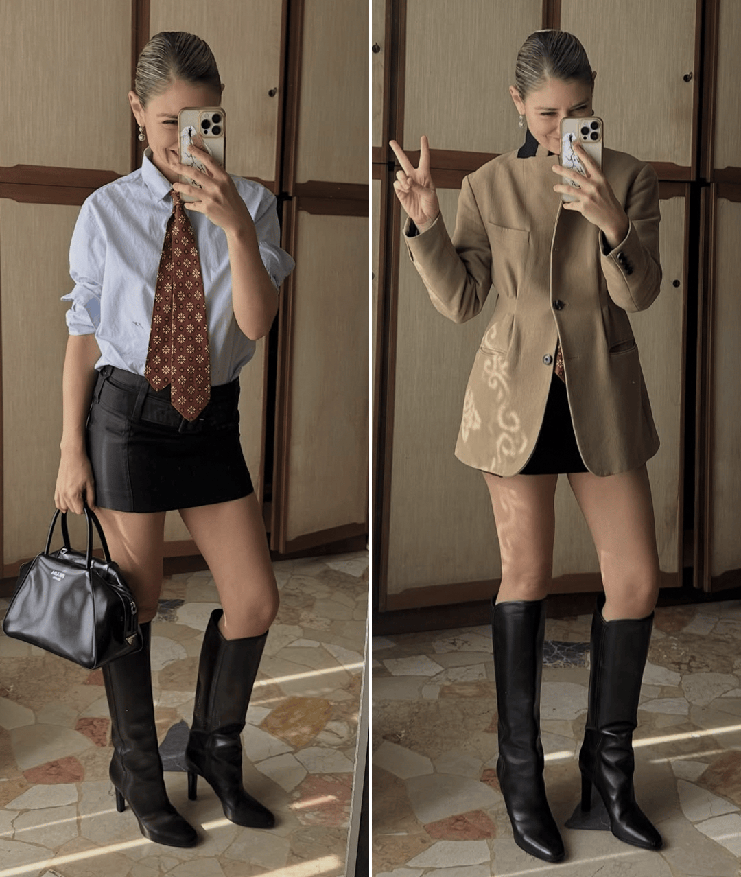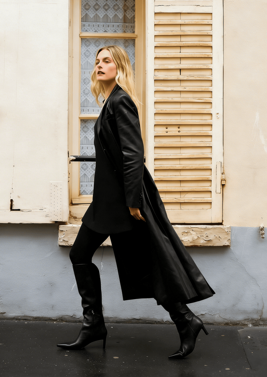 经典及膝黑色长靴搭配短裙或短裤时,秘诀在于保留足够的露肤度。在大衣或外套下,让腿部肌肤、靴口与靴子之间形成一段视觉呼吸区,这是显高显瘦、避免沉闷的关键。怕冷可以靠光腿神器,气温高一点的南方也可以尝试透明黑丝。不过搭黑丝时,最好配廓形比较硬朗的外套,避免显得俗气。