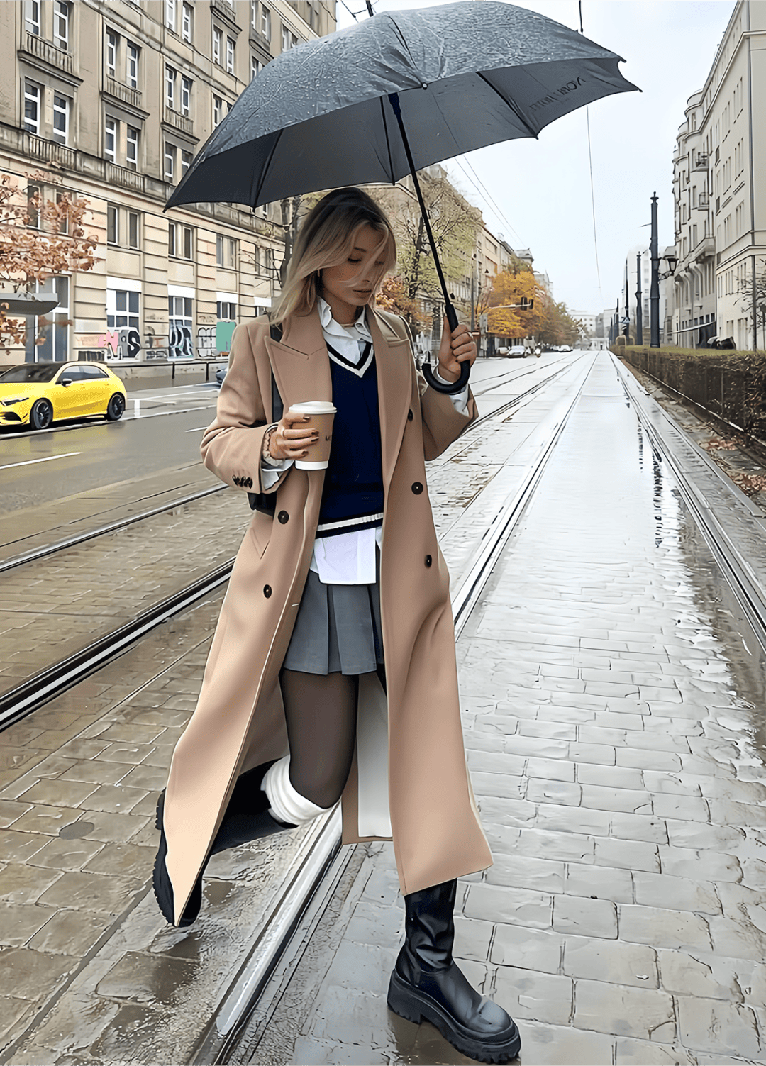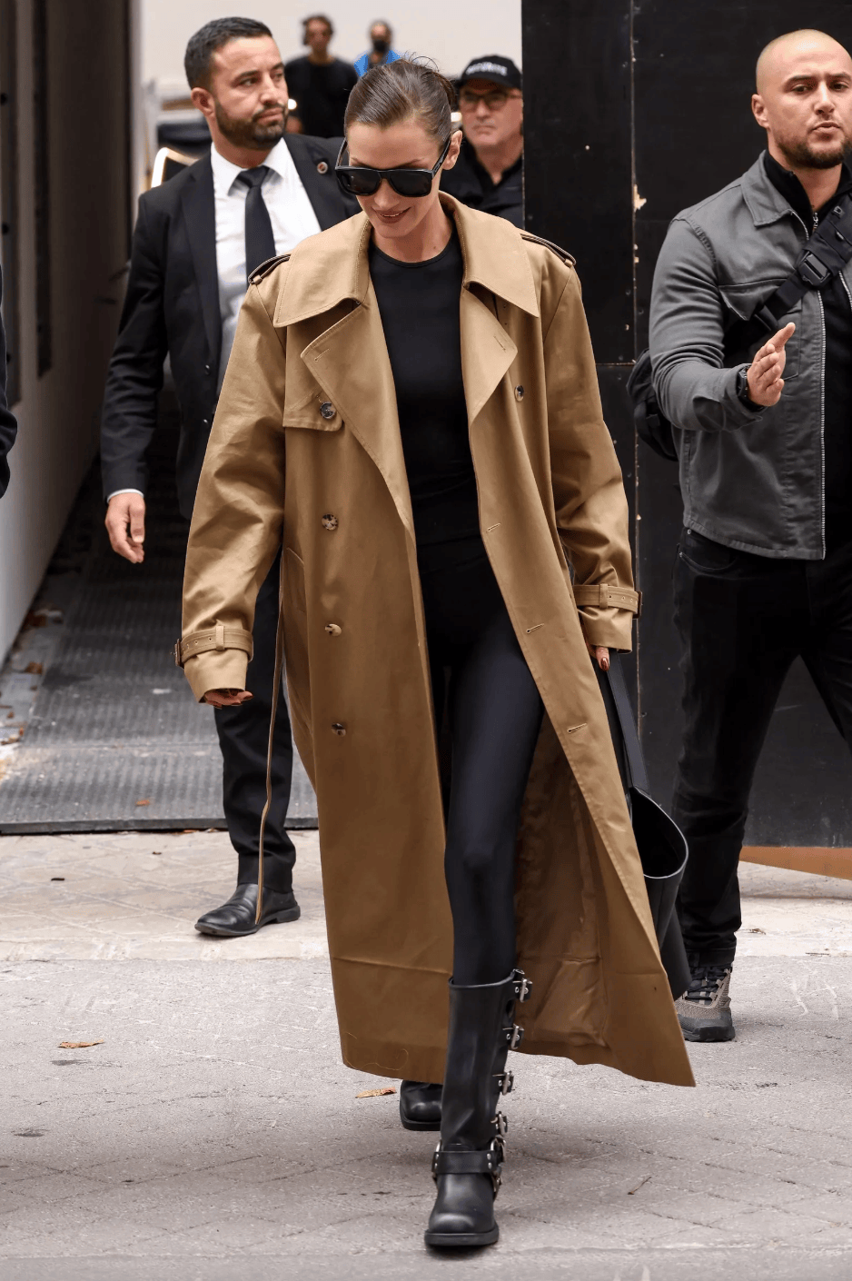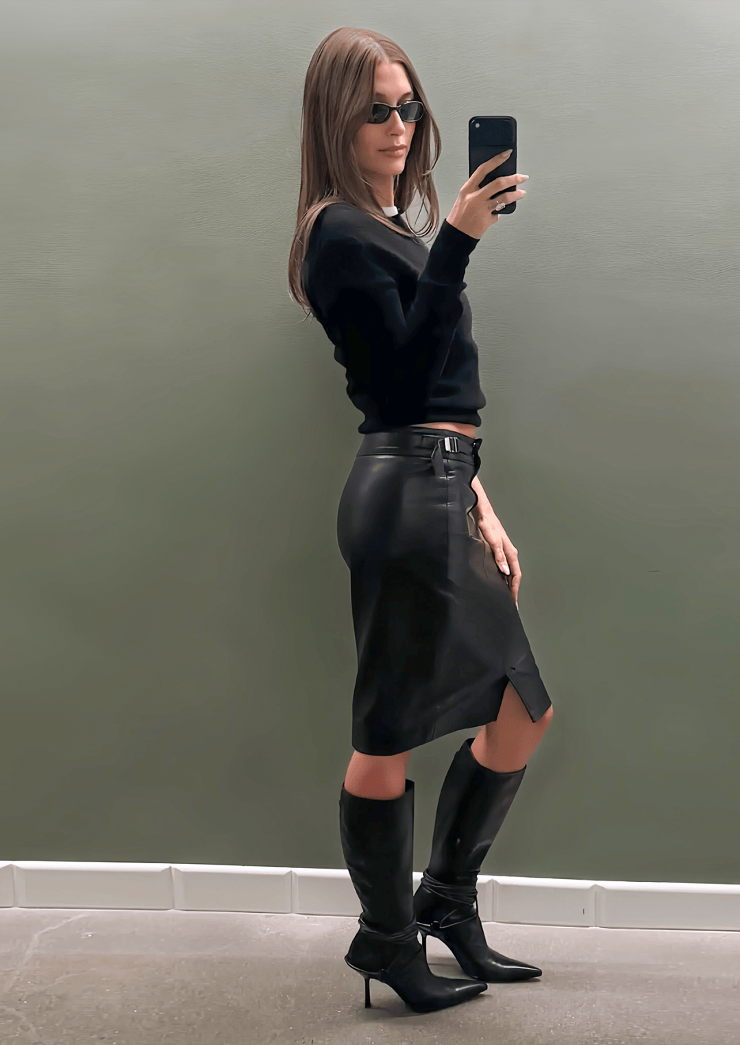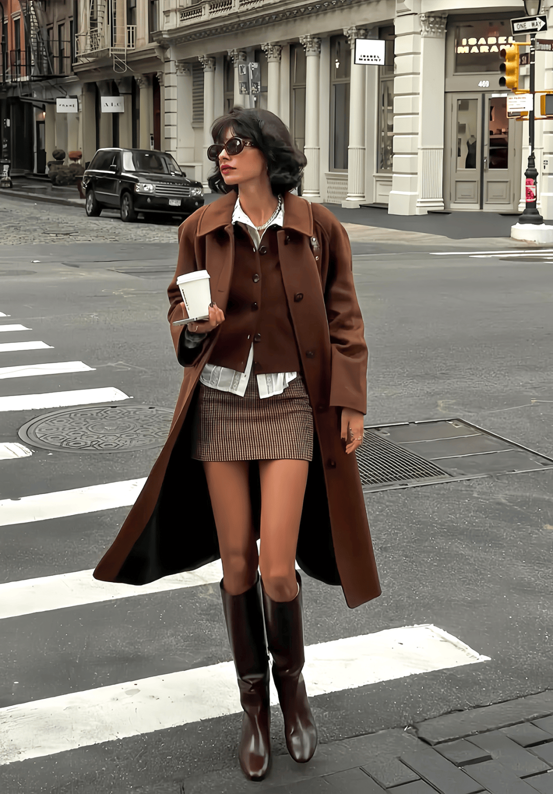 经典及膝黑色长靴搭配短裙或短裤时,秘诀在于保留足够的露肤度。在大衣或外套下,让腿部肌肤、靴口与靴子之间形成一段视觉呼吸区,这是显高显瘦、避免沉闷的关键。怕冷可以靠光腿神器,气温高一点的南方也可以尝试透明黑丝。不过搭黑丝时,最好配廓形比较硬朗的外套,避免显得俗气。