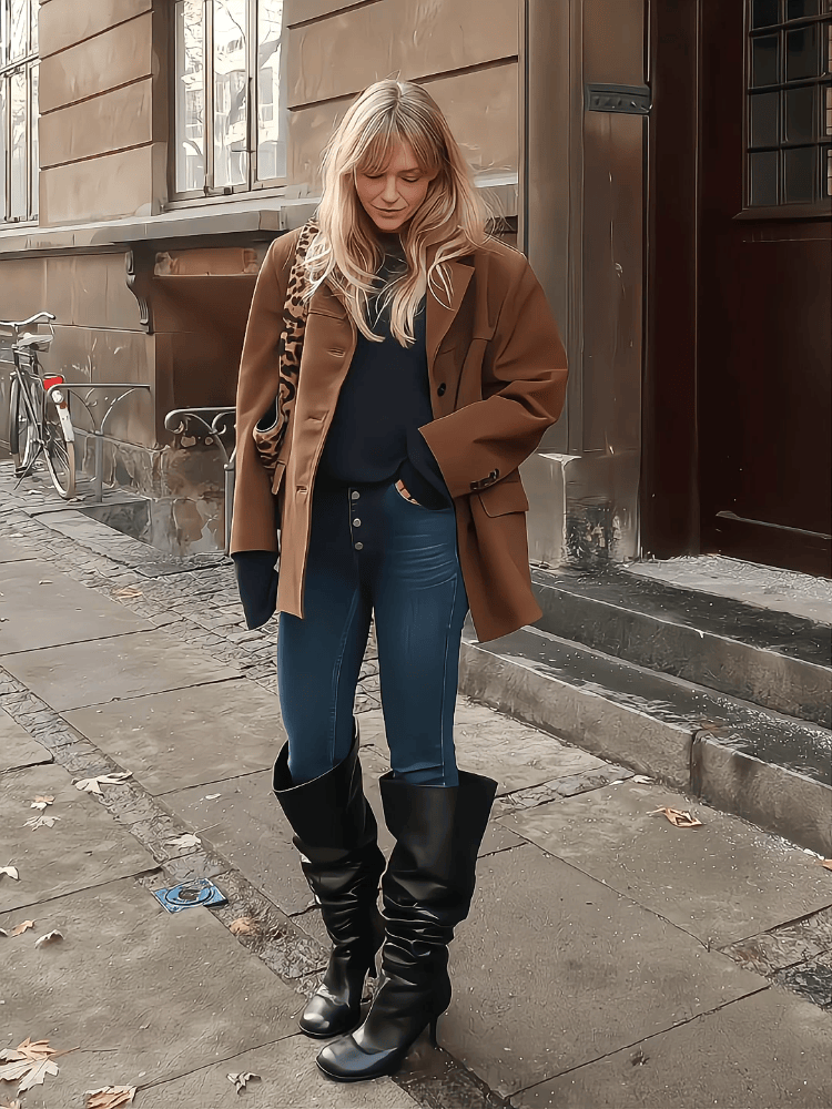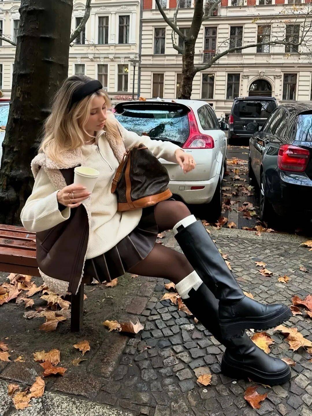 及膝长靴永不过时,但要穿出新意,得留“呼吸区”:在大衣或外套下,让腿部肌肤、靴口与靴子之间有一段空隙(怕冷用光腿神器,南方用透明黑丝),这是显高显瘦的关键。
