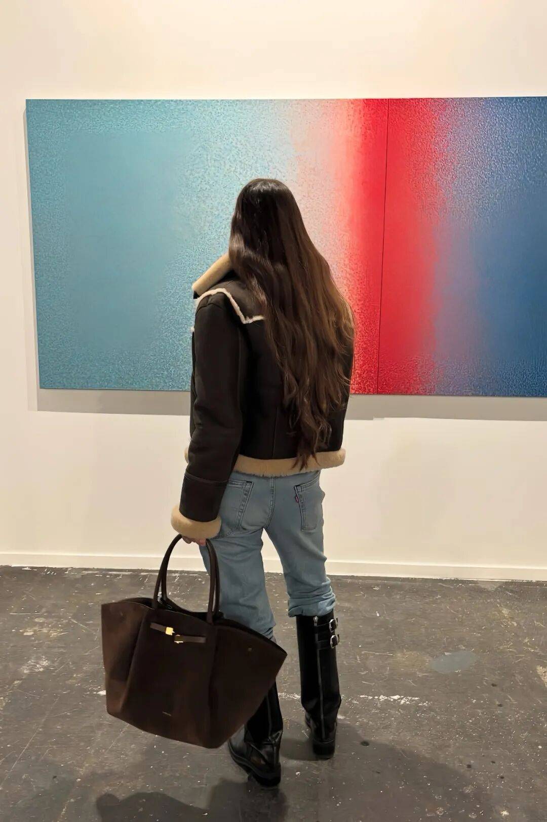 尖头、设计偏成熟的宽口靴,搭配思路可以更加多样化。往年常见的搭配紧身牛仔裤的方法,如Bella的穿搭示范,无论什么时候都不过时。这种搭配不挑外套,无论是长款还是短款,都能轻松穿出静奢感,是日常值得借鉴的经典搭配思路。今年想要穿出新意,可以尝试搭配偏宽松的裤装,将裤脚堆叠在靴口,营造出随性不羁的洒脱感。更进阶的穿法是像Jennie的不对称穿法,一边裤脚塞进靴子,一边松弛地放出来盖住靴子。不过这种穿搭比较考验搭配功力和穿着场景,更适合有态度的时髦精。