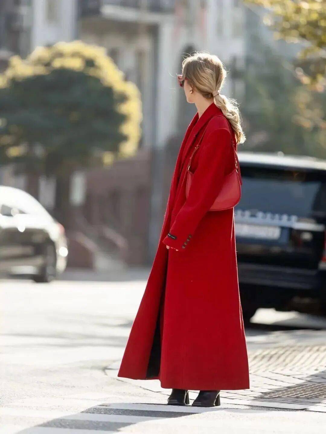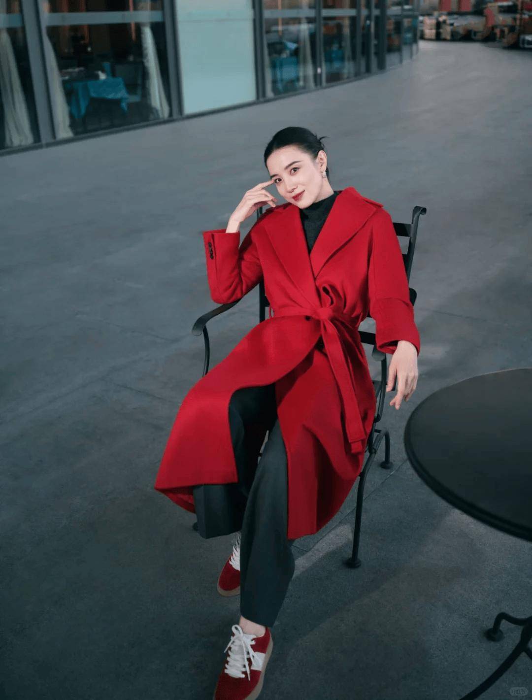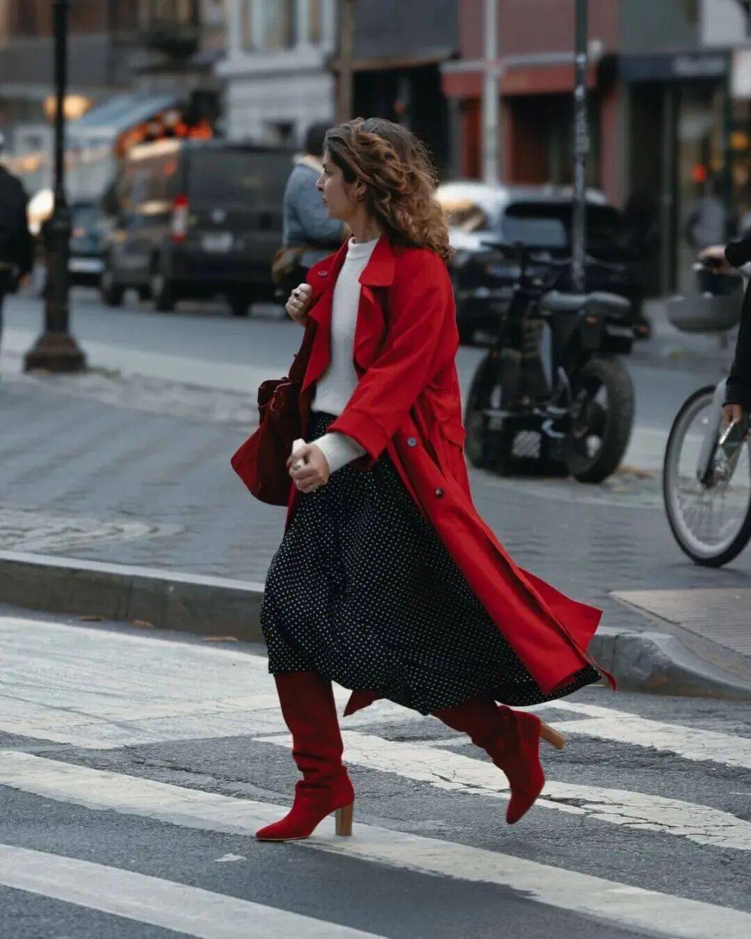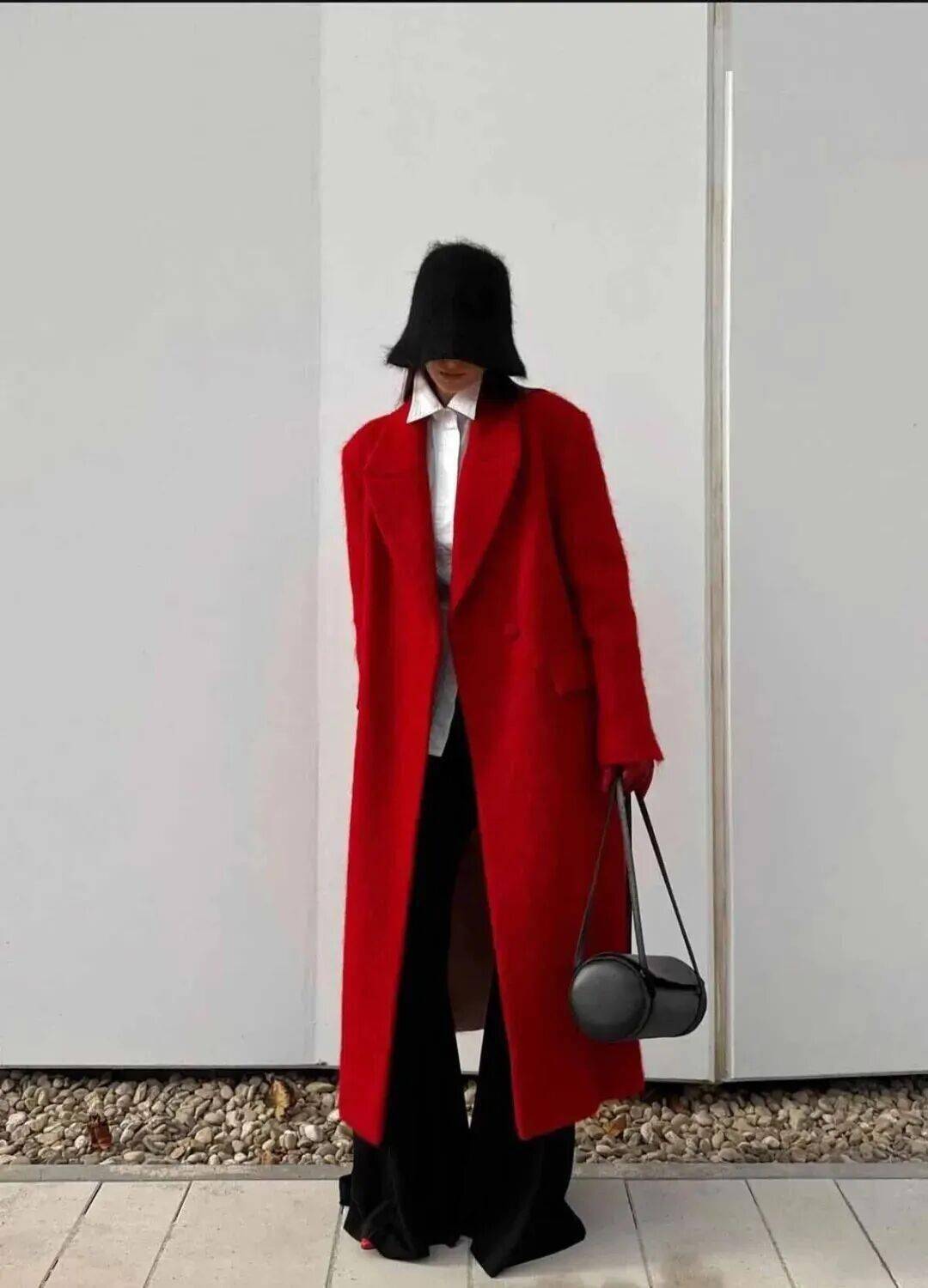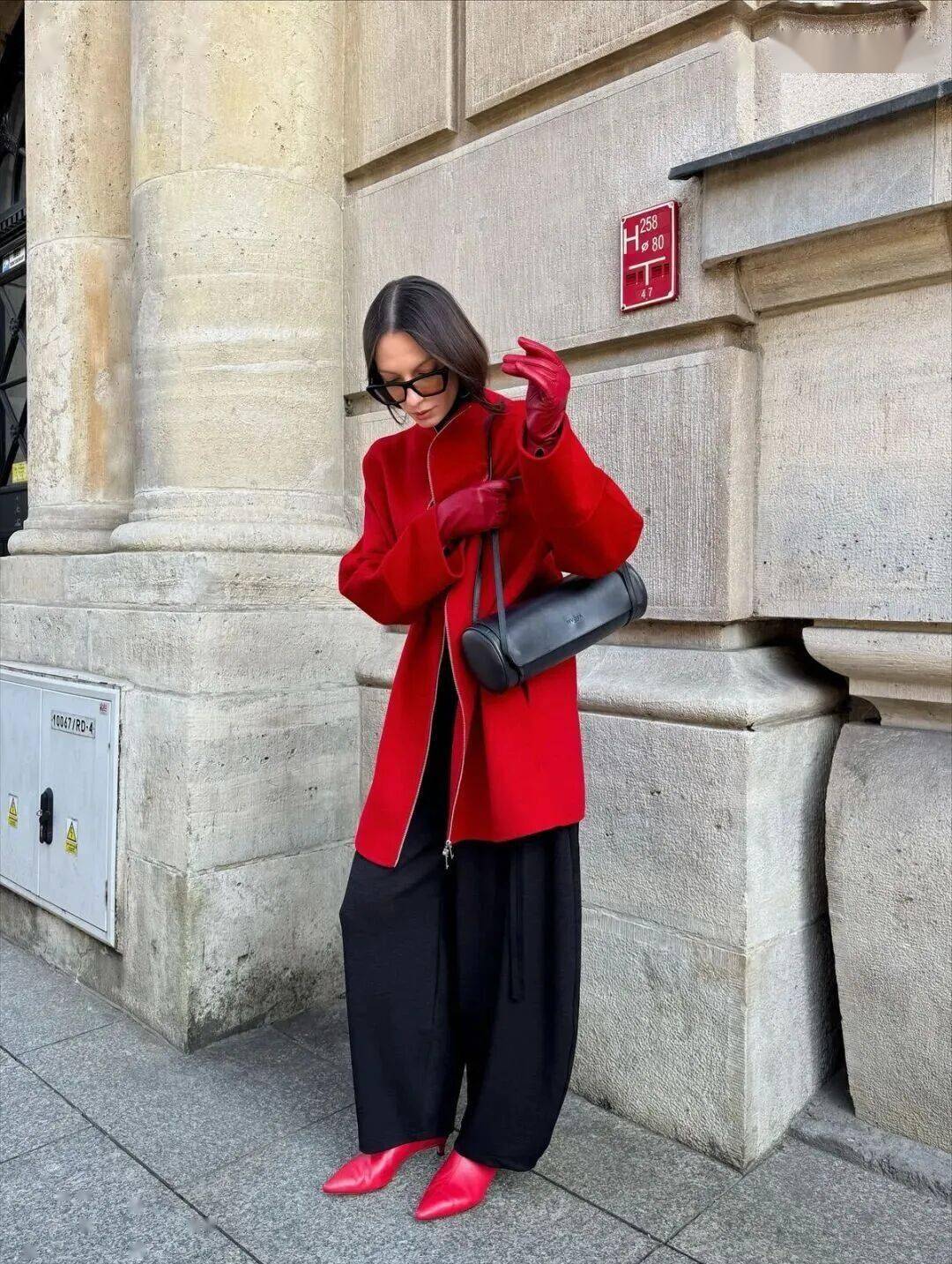 全红造型是对搭配功力的终极考验。秘诀在于用同色系不同材质(如羊毛呢 + 丝绒 + 缎面)与深浅变化(酒红 + 亮红 + 玫红)制造视觉纵深。短款红大衣配阔腿裤,或叠穿短裙 + 膝下靴,轻盈与热烈并存,轻松拿捏“不好惹的好看”。