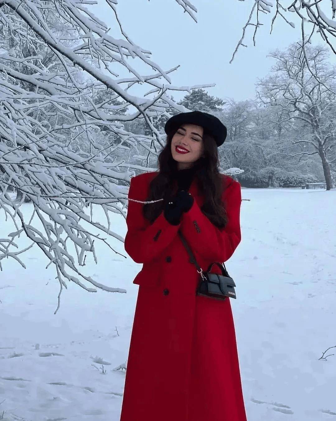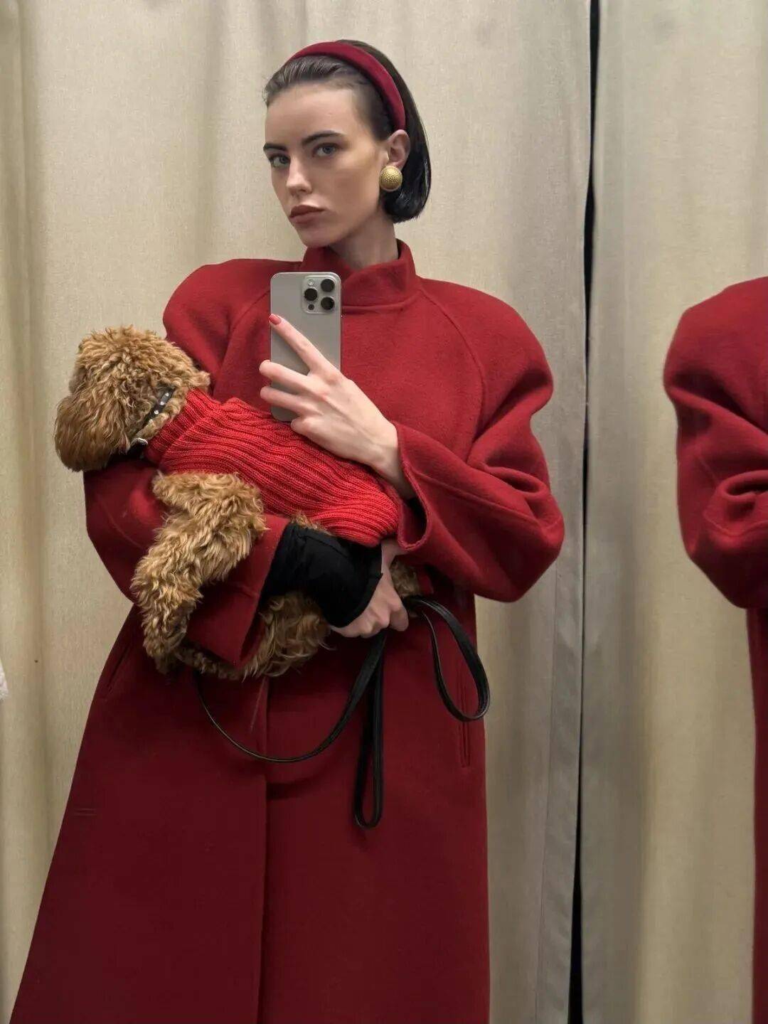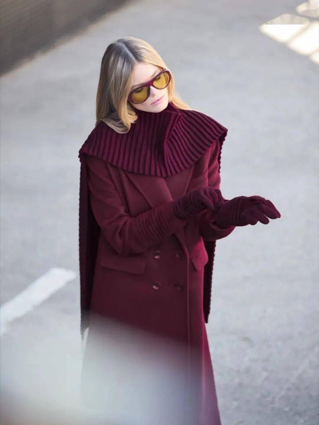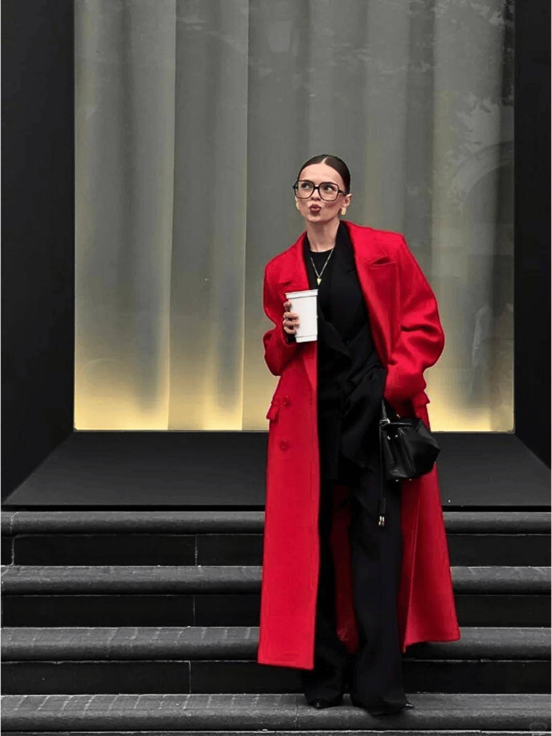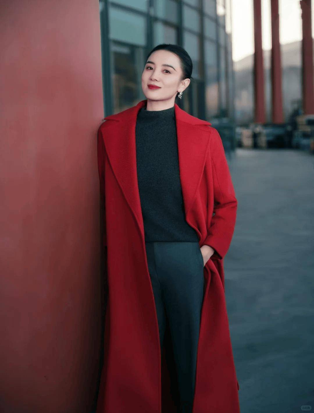 全红造型是对搭配功力的终极考验。秘诀在于用同色系不同材质(如羊毛呢 + 丝绒 + 缎面)与深浅变化(酒红 + 亮红 + 玫红)制造视觉纵深。短款红大衣配阔腿裤,或叠穿短裙 + 膝下靴,轻盈与热烈并存,轻松拿捏“不好惹的好看”。