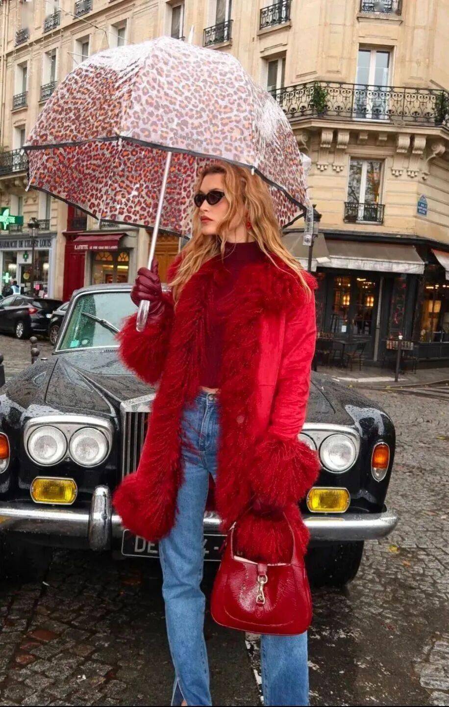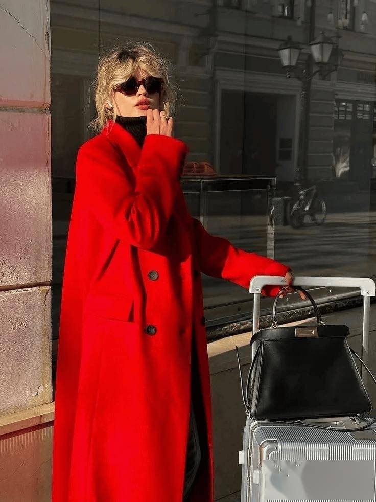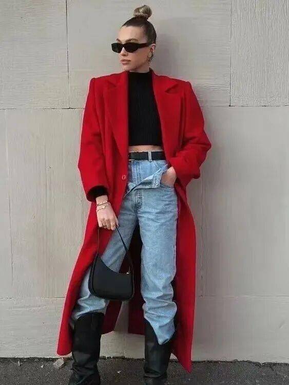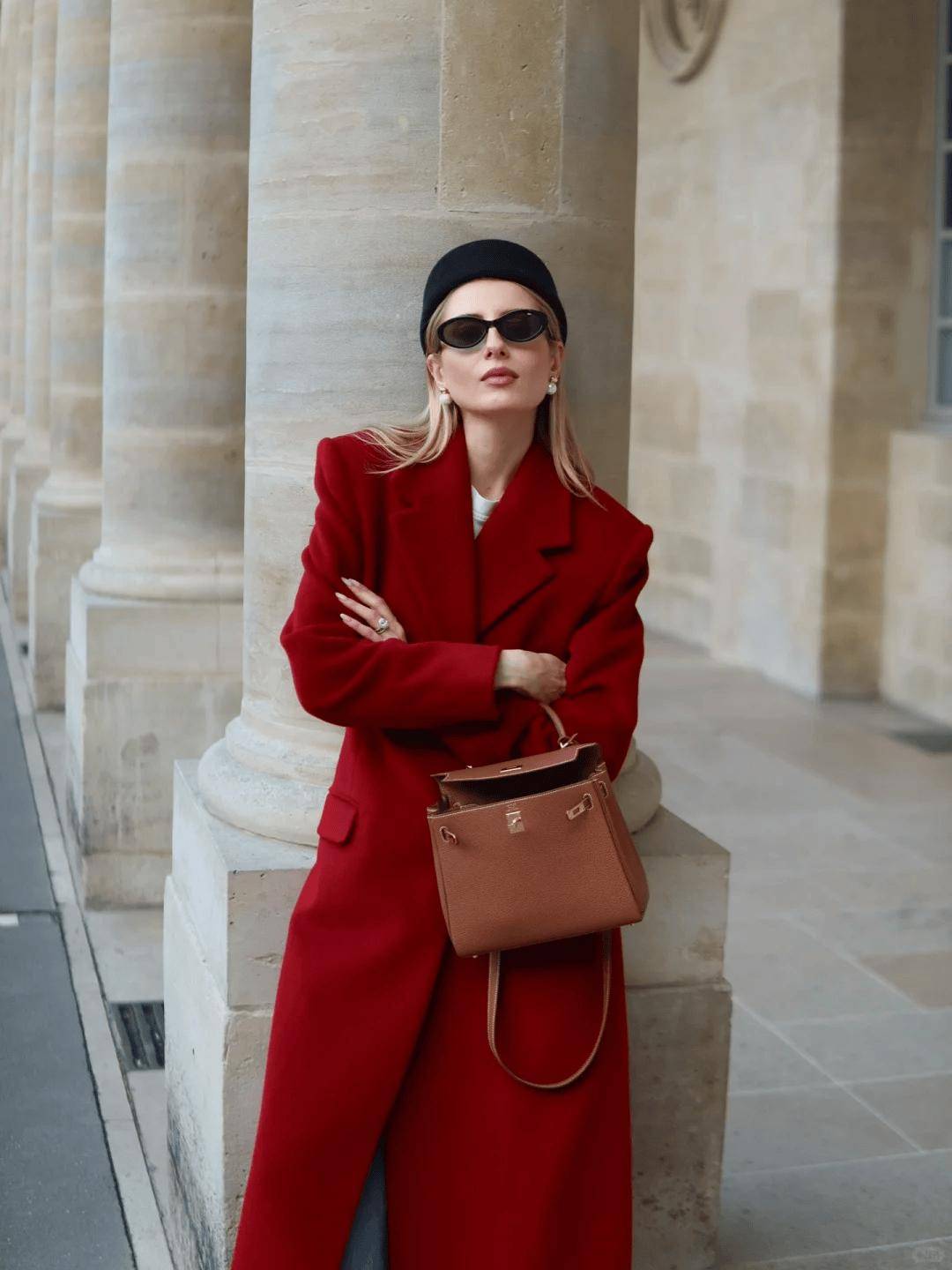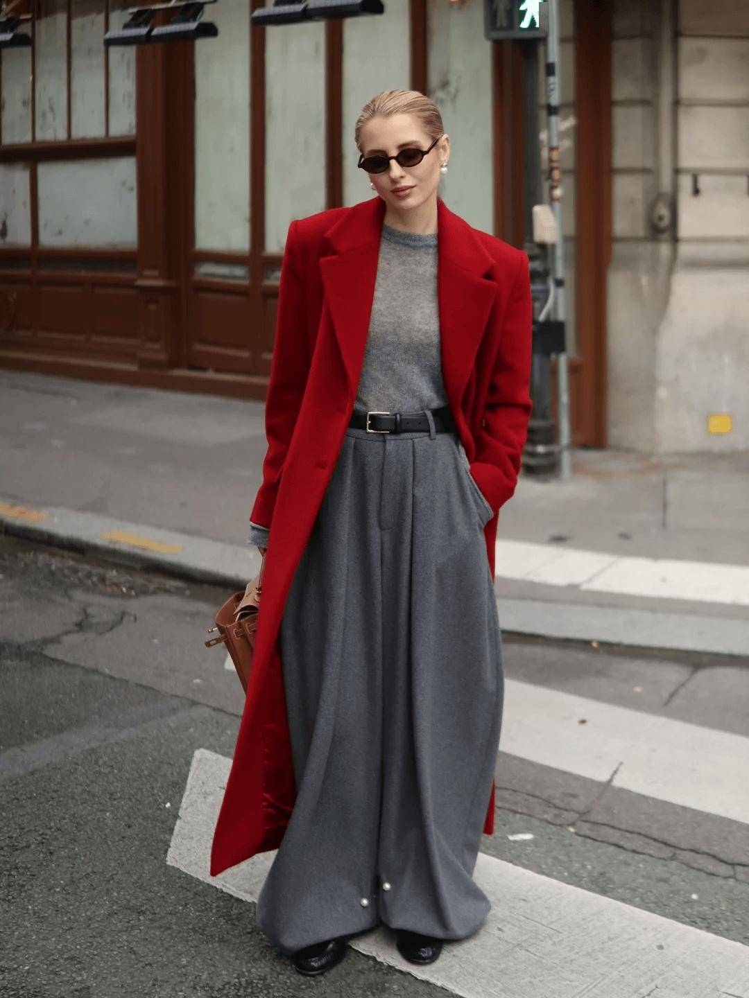 全红造型是对搭配功力的终极考验。秘诀在于用同色系不同材质(如羊毛呢 + 丝绒 + 缎面)与深浅变化(酒红 + 亮红 + 玫红)制造视觉纵深。短款红大衣配阔腿裤,或叠穿短裙 + 膝下靴,轻盈与热烈并存,轻松拿捏“不好惹的好看”。