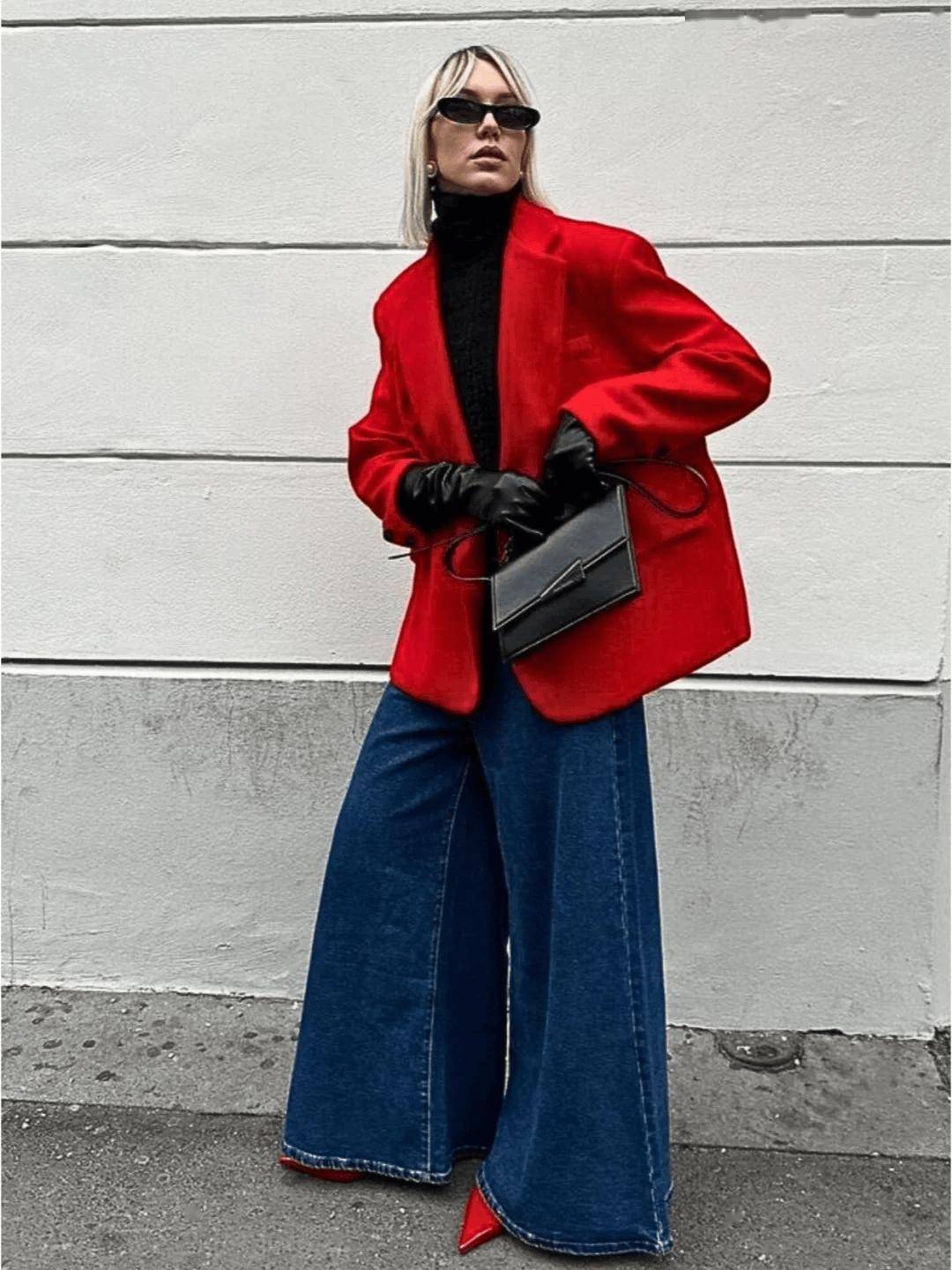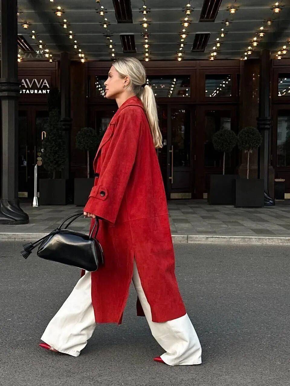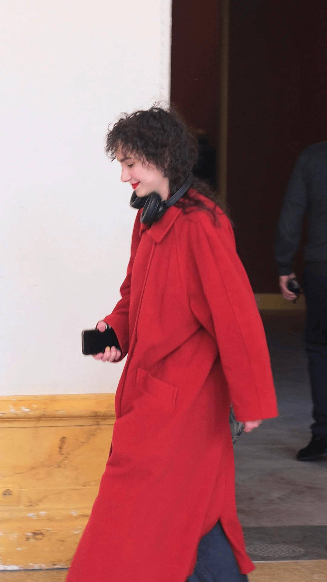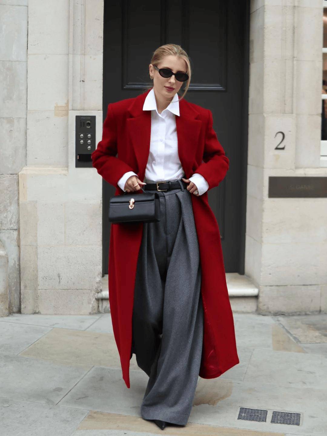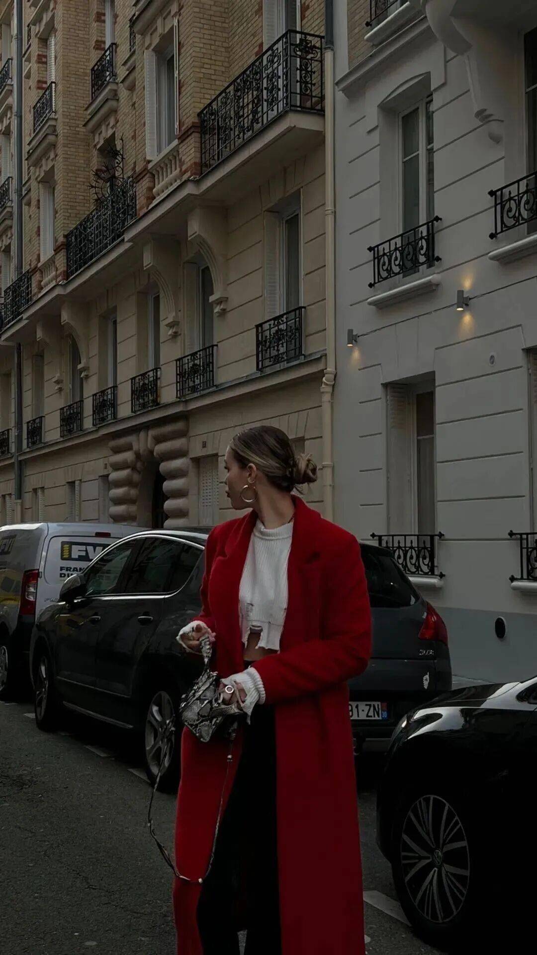全红造型是对搭配功力的终极考验。秘诀在于用同色系不同材质(如羊毛呢 + 丝绒 + 缎面)与深浅变化(酒红 + 亮红 + 玫红)制造视觉纵深。短款红大衣配阔腿裤,或叠穿短裙 + 膝下靴,轻盈与热烈并存,轻松拿捏“不好惹的好看”。
