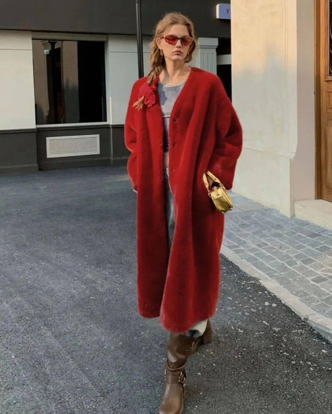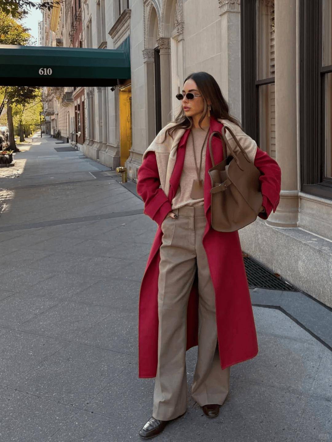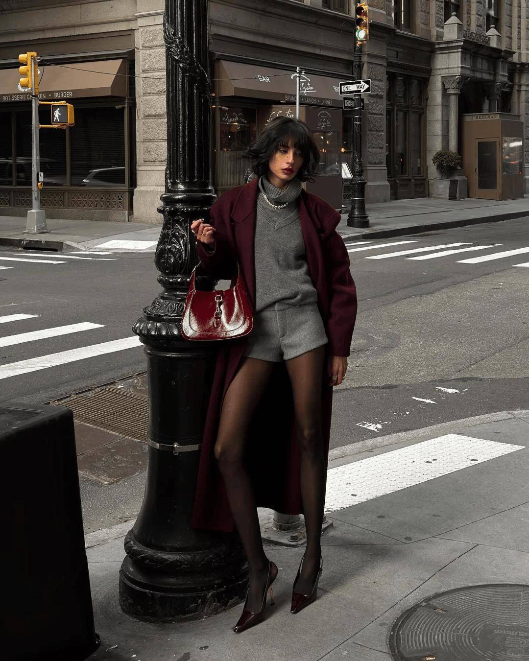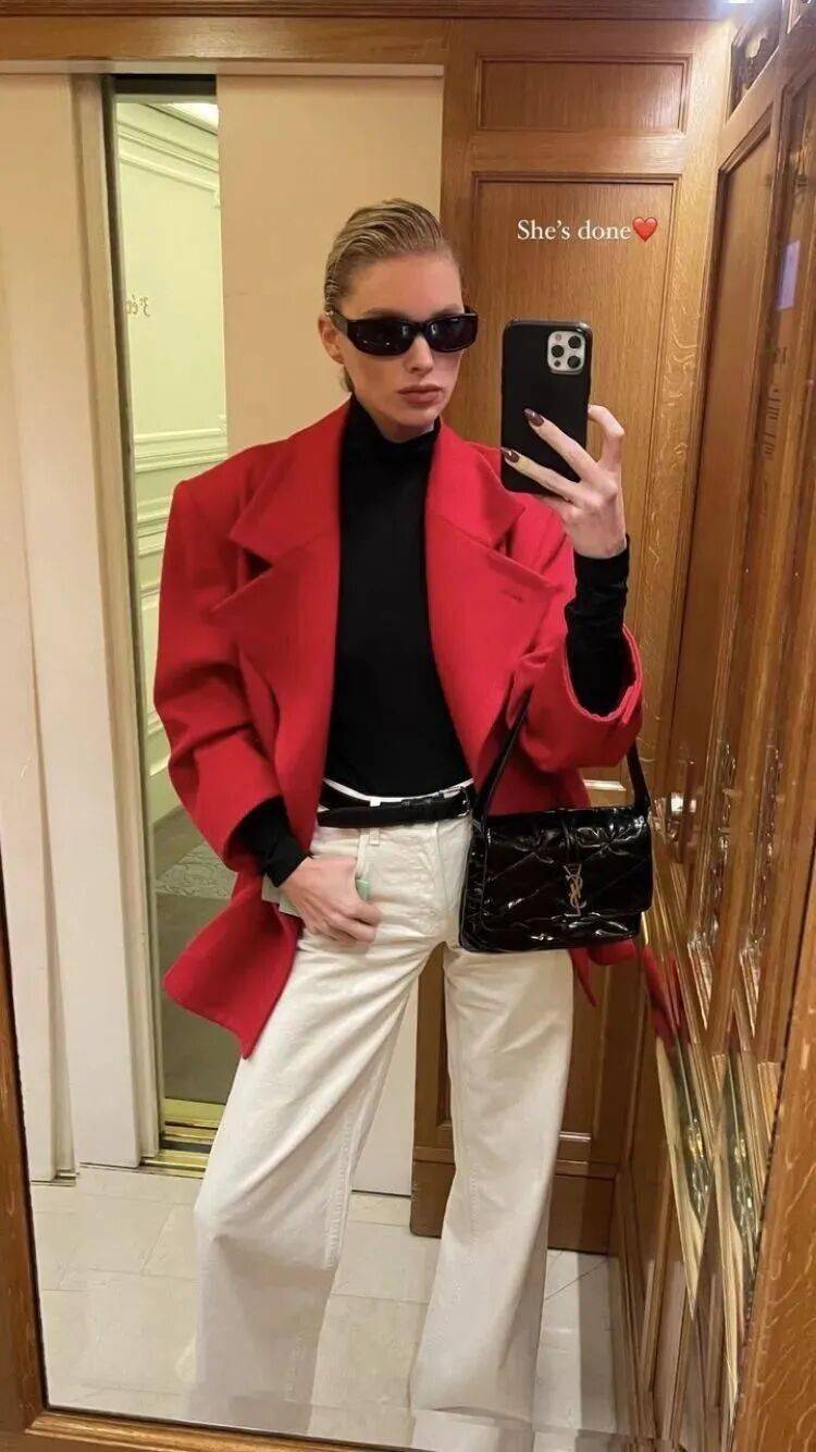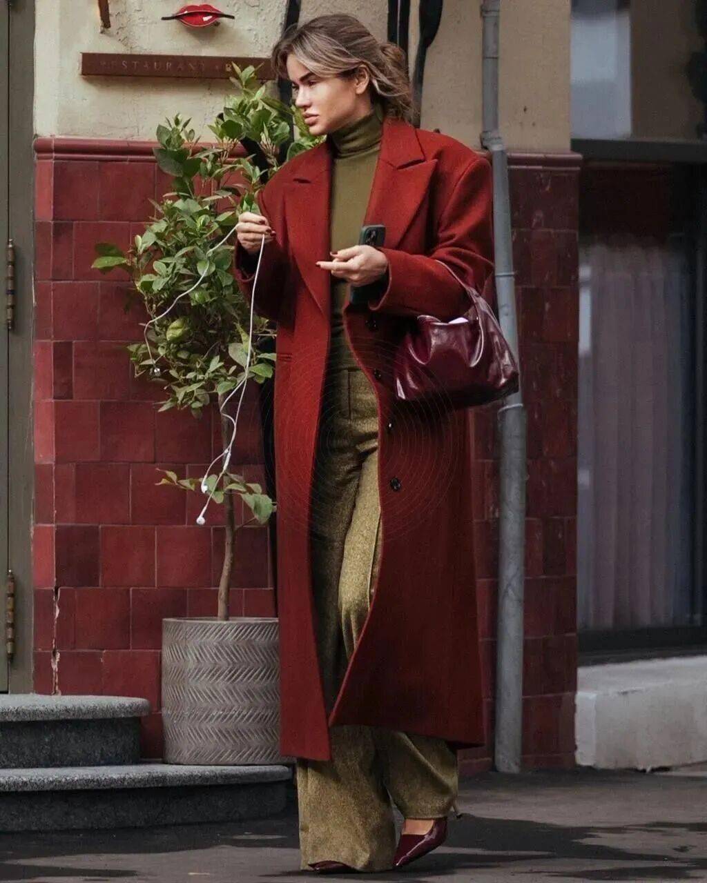 全红造型是对搭配功力的终极考验。秘诀在于用同色系不同材质(如羊毛呢 + 丝绒 + 缎面)与深浅变化(酒红 + 亮红 + 玫红)制造视觉纵深。短款红大衣配阔腿裤,或叠穿短裙 + 膝下靴,轻盈与热烈并存,轻松拿捏“不好惹的好看”。