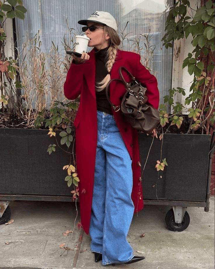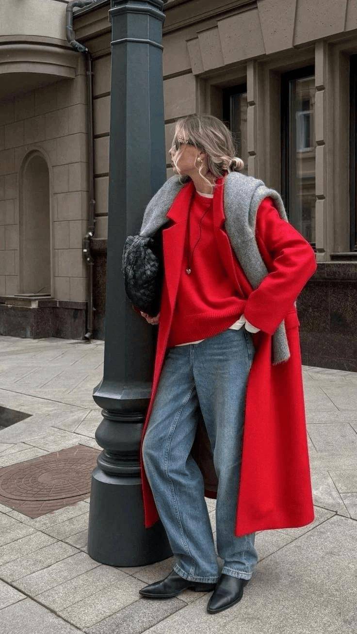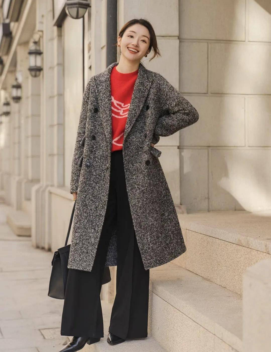 在上述搭配基础上,再穿上一件灰色大衣,整体造型既保暖,又休闲中带着高级时尚感。也可以单独穿红色毛衣,外搭灰色大衣,看起来和谐稳重,同时增添几分优雅气息,容易给别人留下深刻印象。这种搭配适合多种场合,无论是逛街还是聚会都很合适。