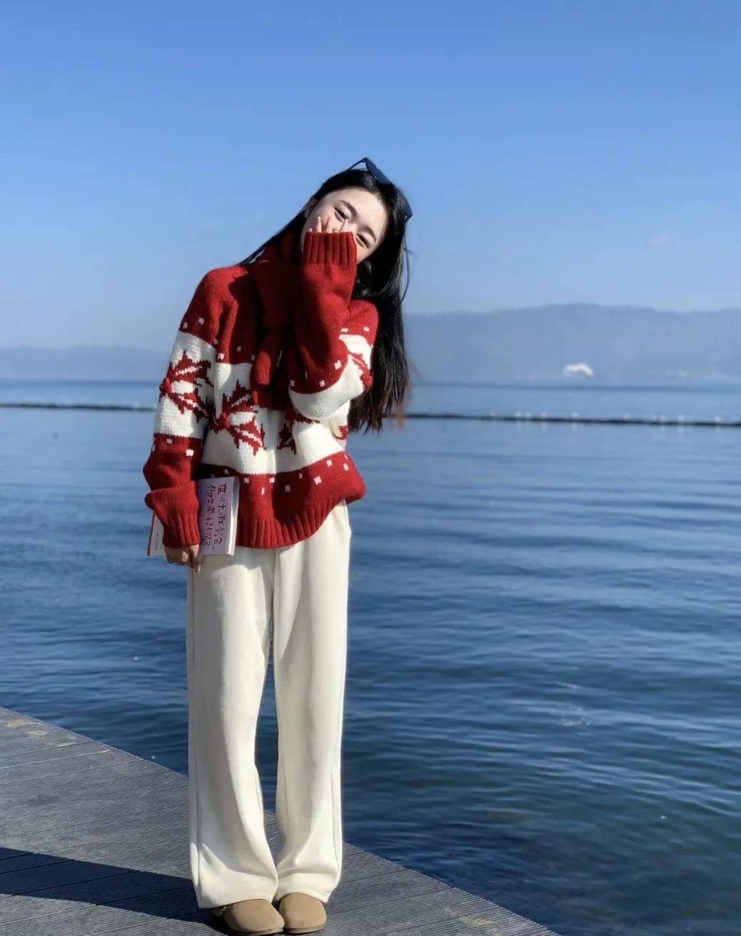鲜艳的红色毛衣能很好地衬托肤色,搭配简约大方的白色阔腿裤,整体造型瞬间变得时尚且充满层次感,还很显白。白色阔腿裤为穿搭增添清新与优雅,中和红色毛衣的强烈视觉冲击力,使整体更加和谐且富有平衡感。这种搭配适合职场女性,展现出专业又不失时尚的气质。