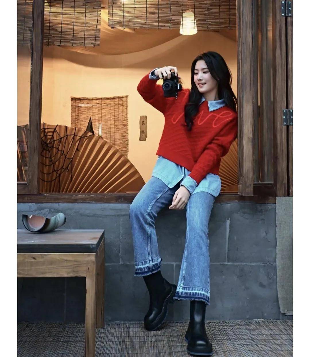 红色毛衣作为外层服饰,鲜艳的色彩瞬间吸引他人目光。内搭蓝色衬衫,为整体造型增添沉稳与宁静气息,还能映衬皮肤显白。下半身搭配蓝色系牛仔裤,使整个穿搭简单又时尚,还有显高效果。这种搭配适合日常出行,既舒适又充满活力。