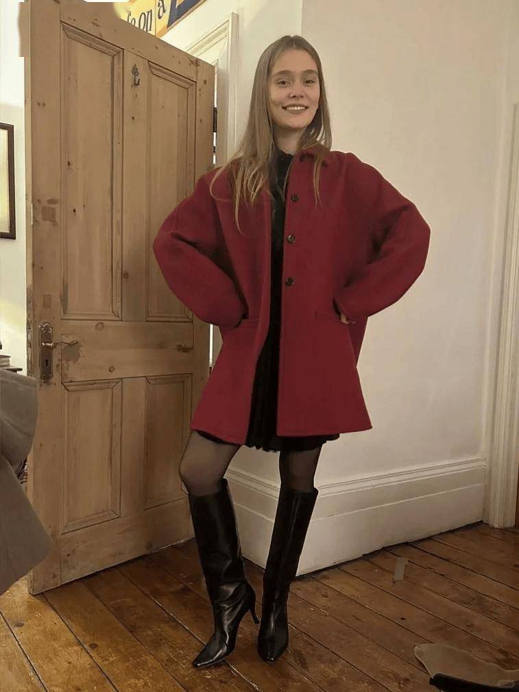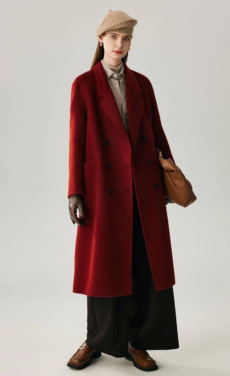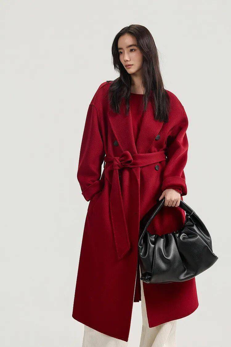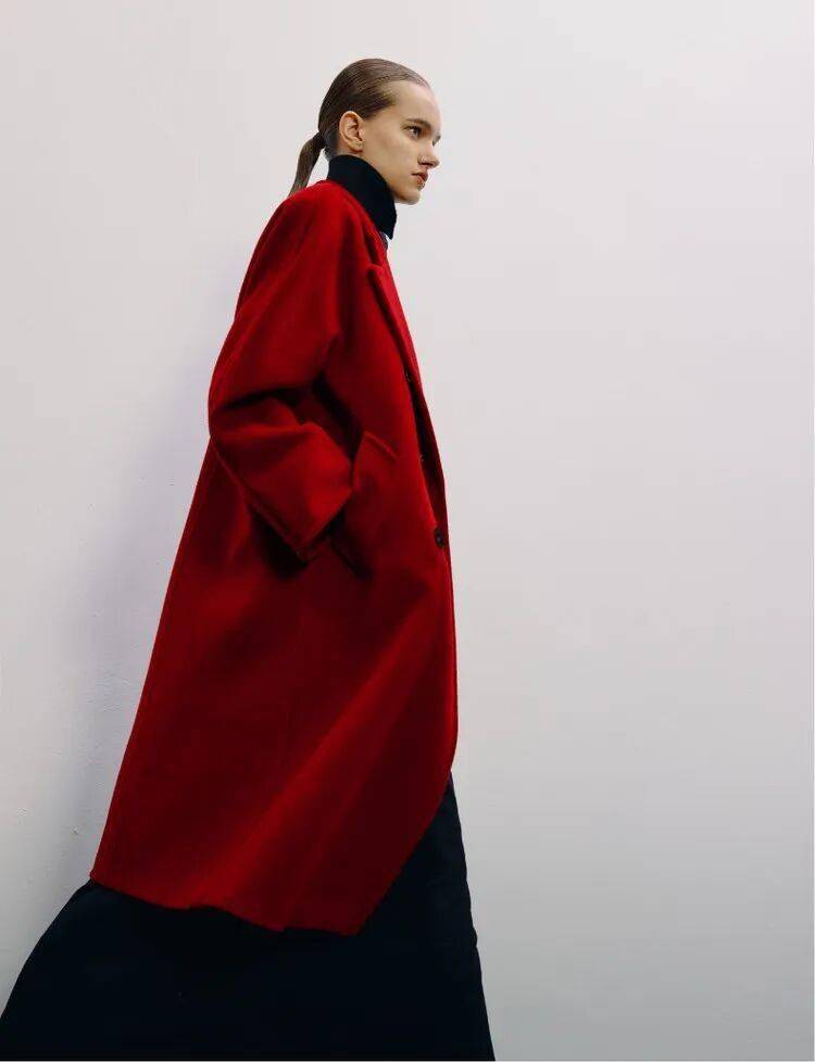 对于身高焦虑者来说,及腰或臀上的短款红大衣是冬日“显高神器”。它凭借利落的箱型剪裁或适度宽松的版型,摒弃了长款的拖沓感,以轻盈姿态聚焦视线,尤其适合小个子星人。职场中,剪裁合身的H型短大衣搭配垂坠阔腿裤(裤长盖过鞋面),塑造流畅纵向线条,内搭简约针织衫,用一抹红点亮办公室的沉闷空气。
