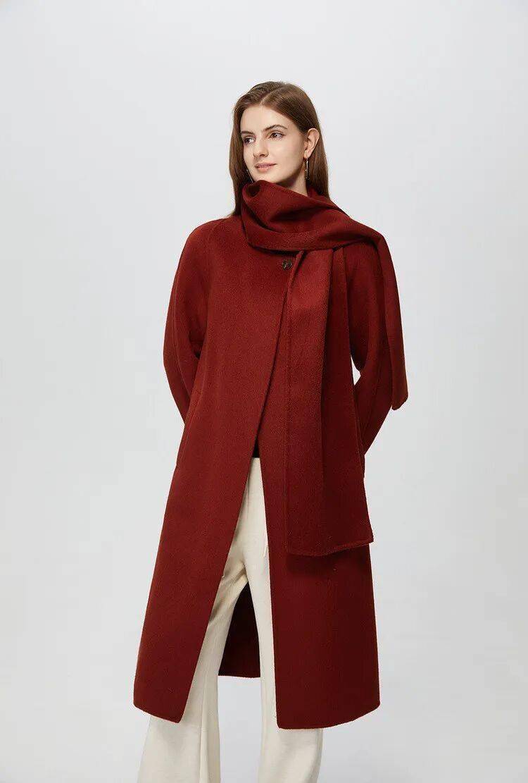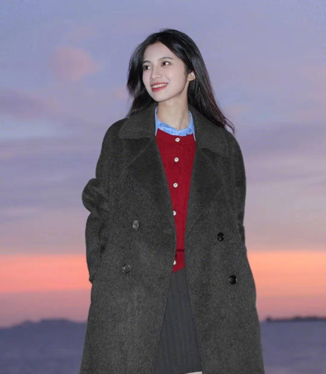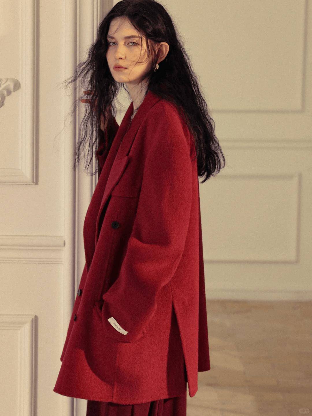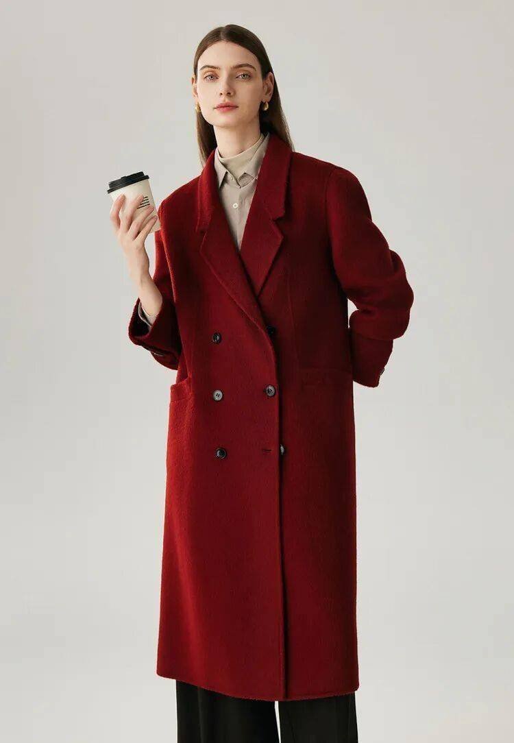 对于身高焦虑者来说,及腰或臀上的短款红大衣是冬日“显高神器”。它凭借利落的箱型剪裁或适度宽松的版型,摒弃了长款的拖沓感,以轻盈姿态聚焦视线,尤其适合小个子星人。职场中,剪裁合身的H型短大衣搭配垂坠阔腿裤(裤长盖过鞋面),塑造流畅纵向线条,内搭简约针织衫,用一抹红点亮办公室的沉闷空气。