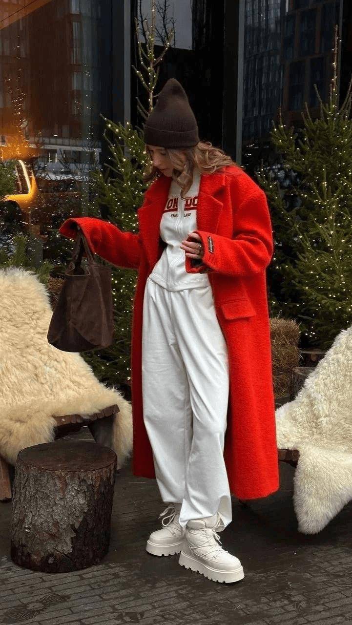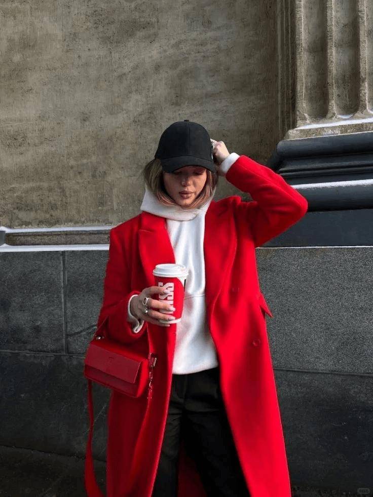 红色大衣常自带仪式感滤镜,而白色的加入恰似一阵穿堂风,吹散了厚重与严肃。白色卫衣的休闲基因与红大衣的正式感碰撞,瞬间注入年轻活力;白色阔腿裤则以流畅线条平衡红色的浓烈,既有夺目野心,又不失高级风度。通勤时,选择红 + 白 + 黑三色叠穿,利落中带着柔韧,可实现职场与生活场景的无缝切换。