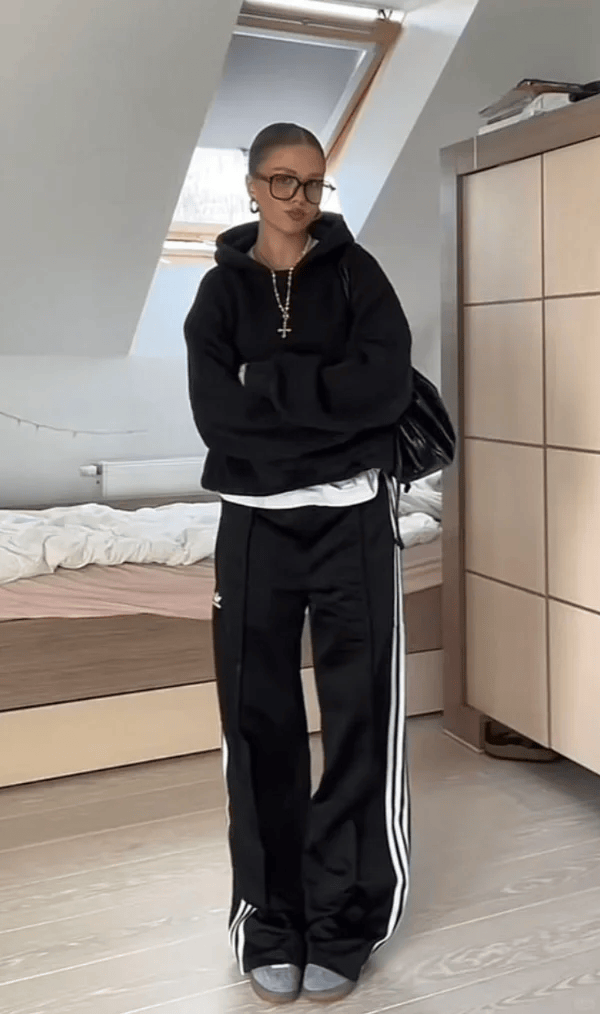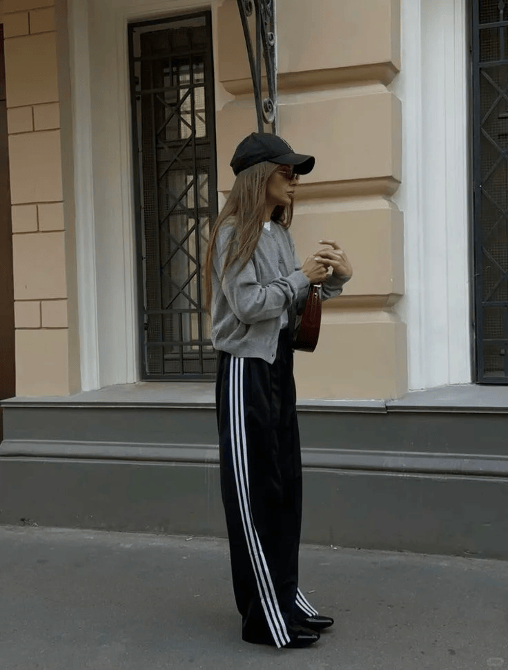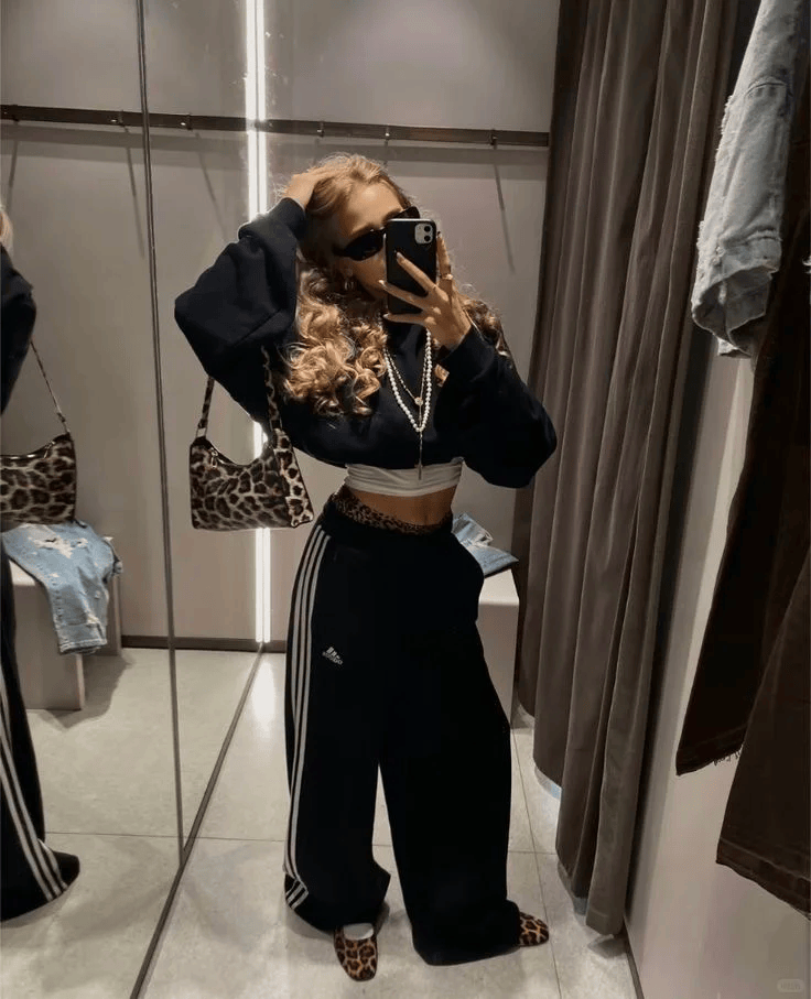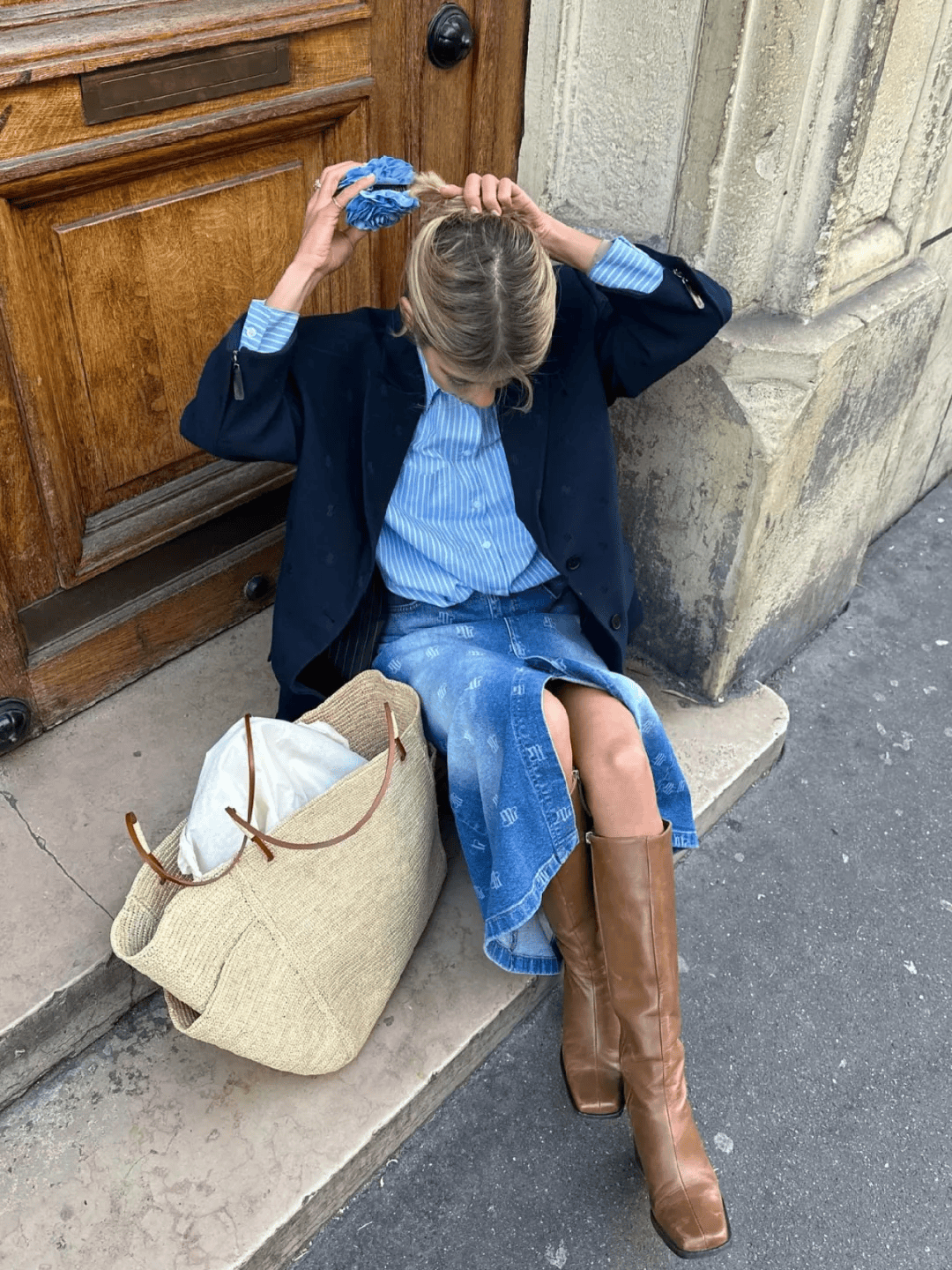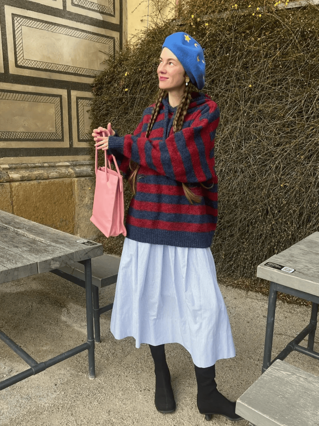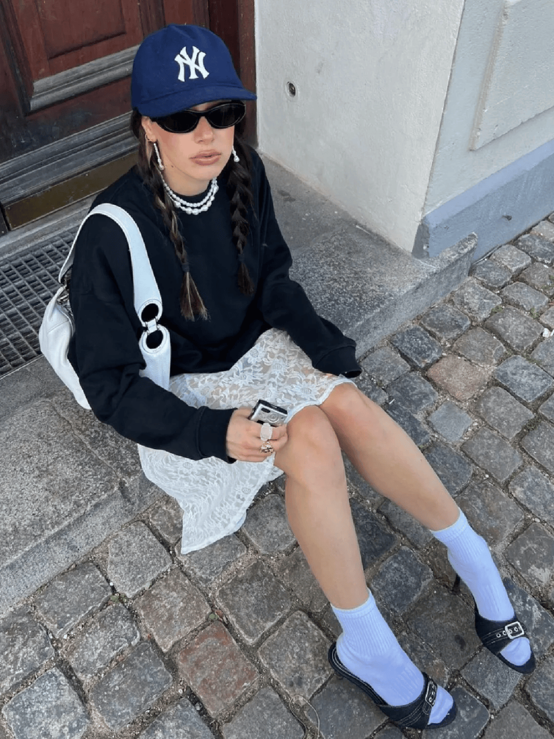 温柔通勤:藏蓝卫衣+浅蓝真丝半裙,休闲与精致交融。