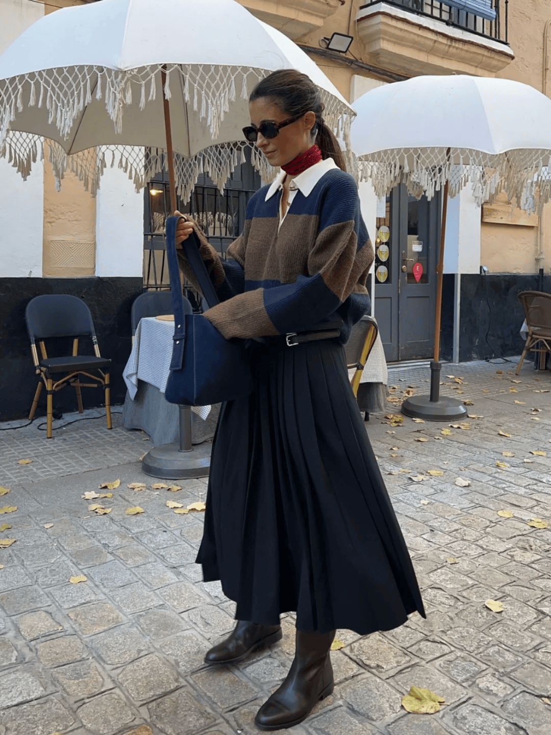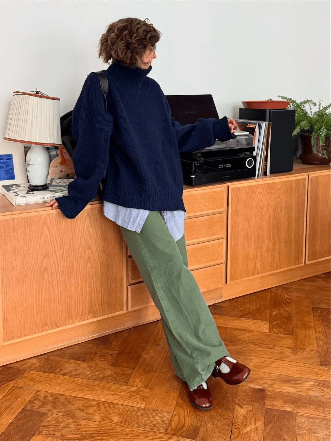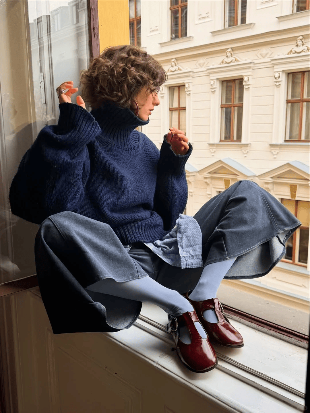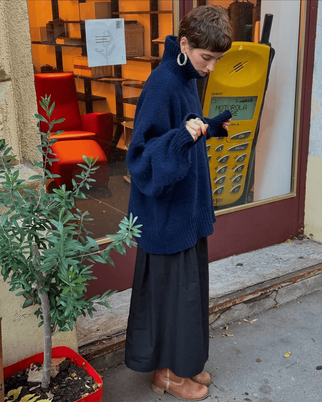 Oversize藏蓝高领毛衣+黑色半裙+短靴,慵懒高级;内露白衬衫领口,层次分明。