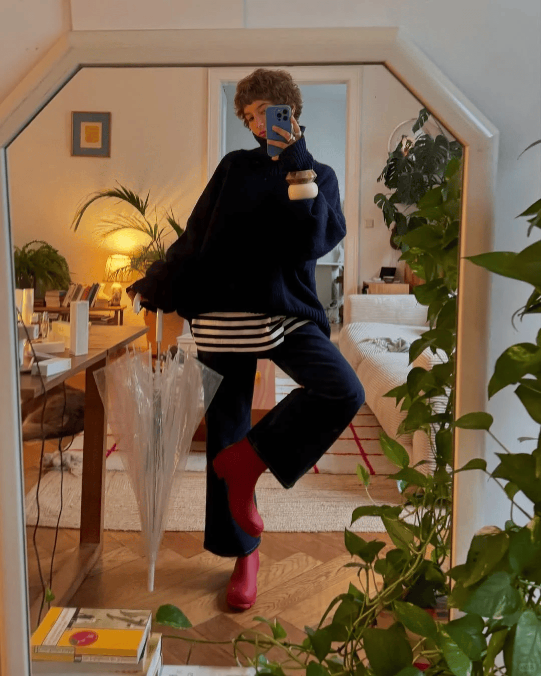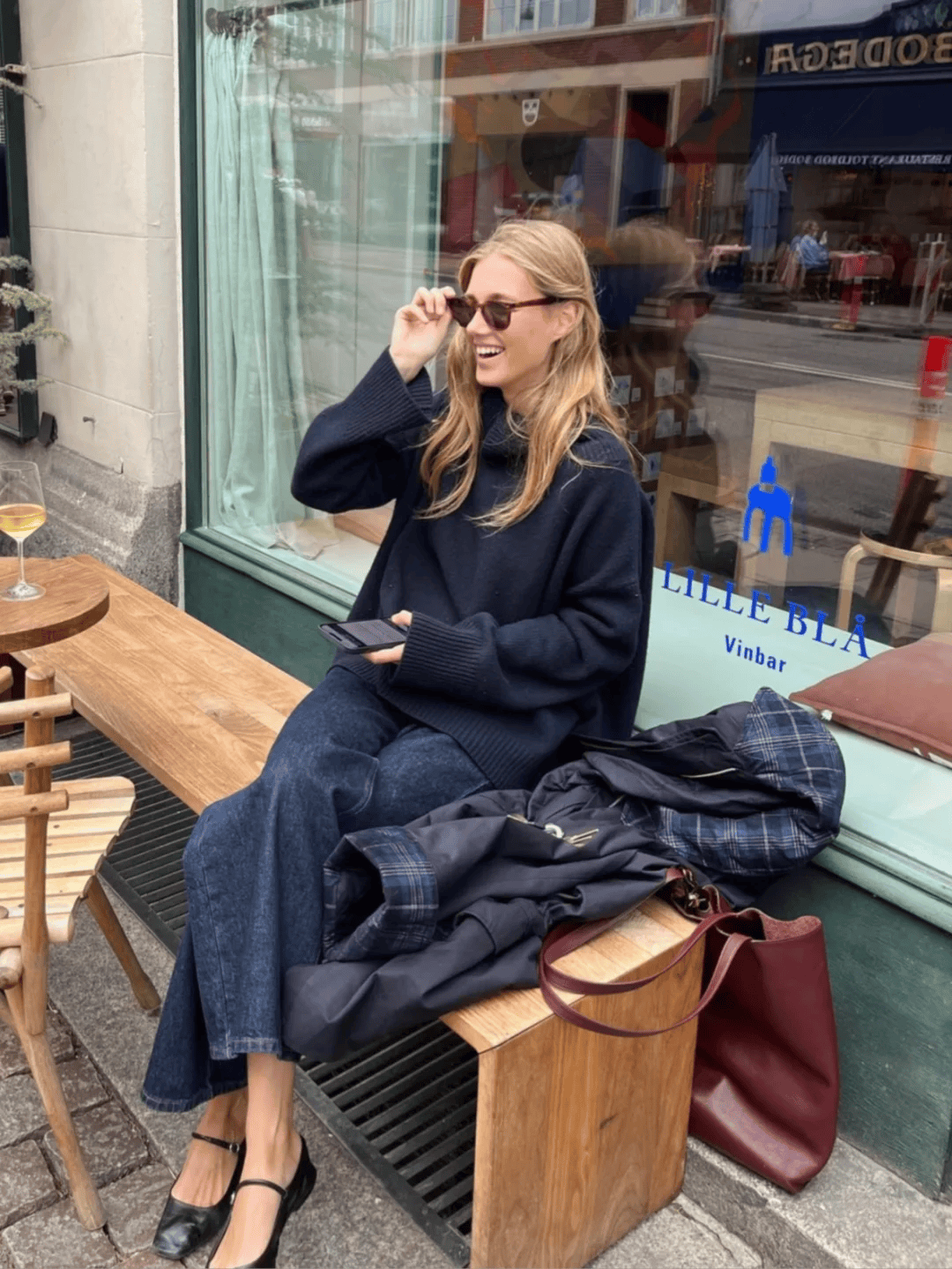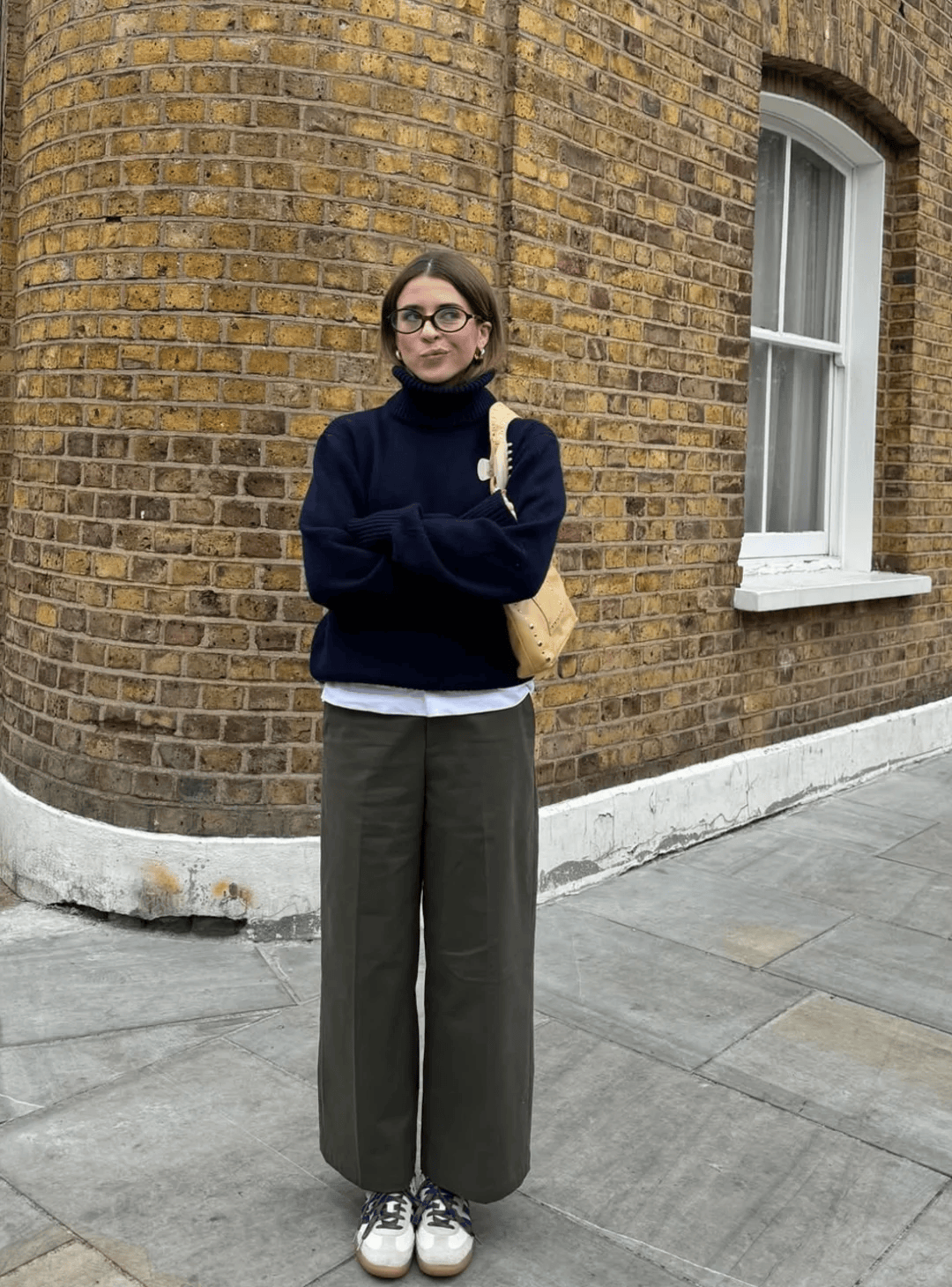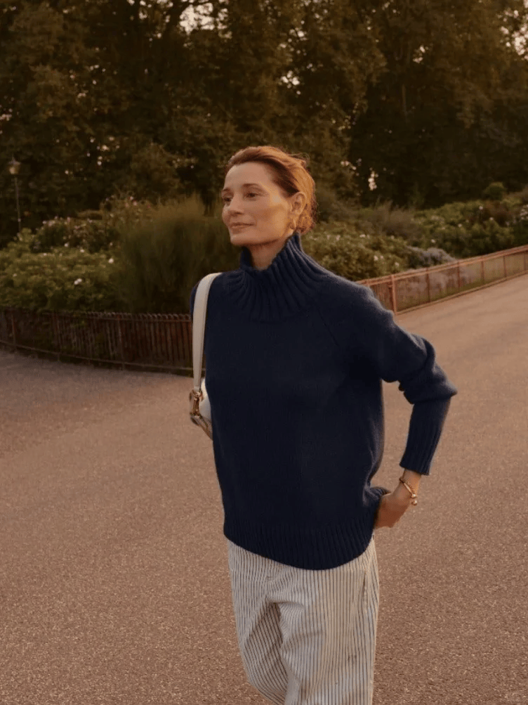 Oversize藏蓝高领毛衣+黑色半裙+短靴,慵懒高级;内露白衬衫领口,层次分明。