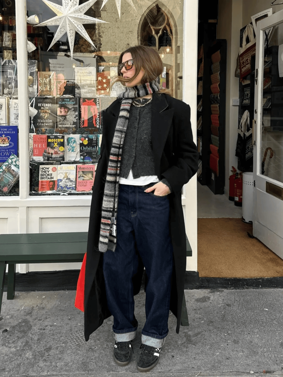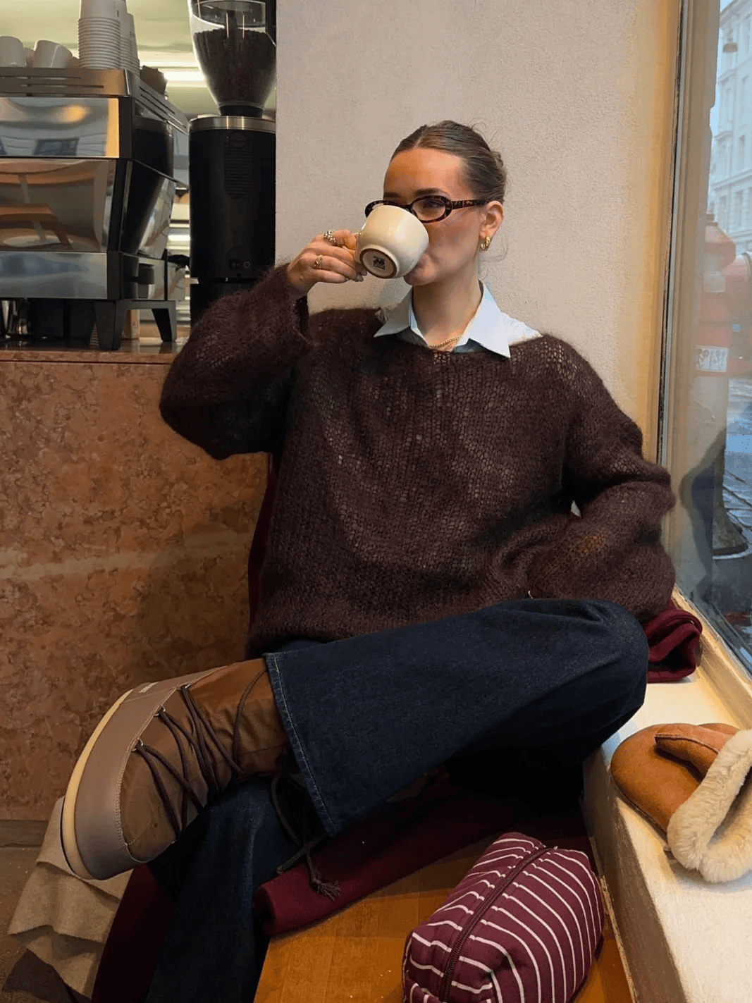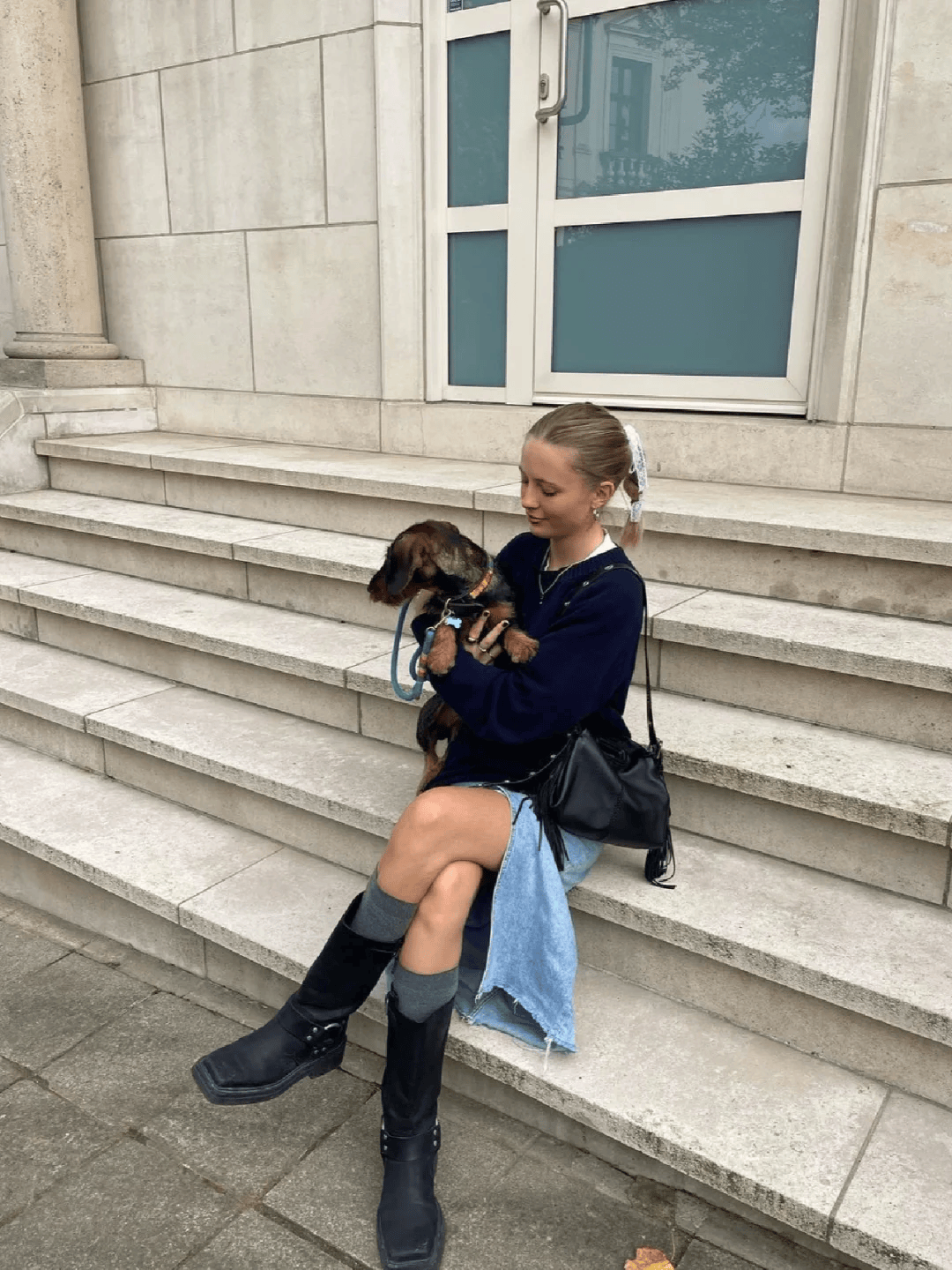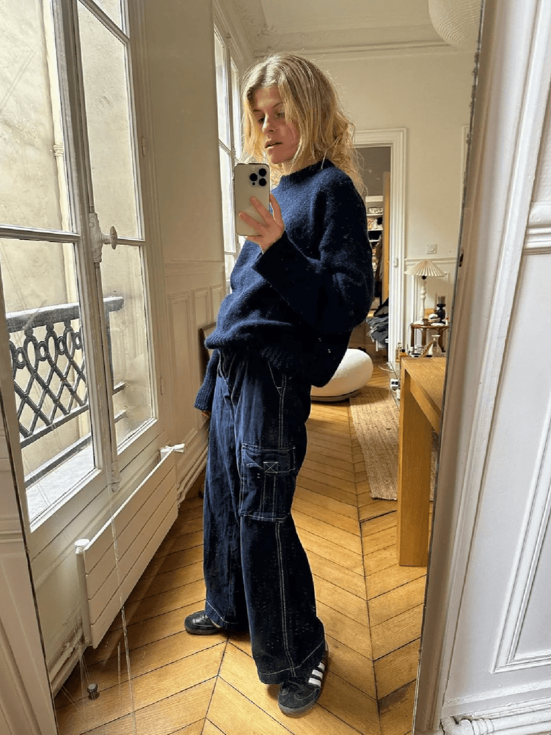 Oversize藏蓝高领毛衣+黑色半裙+短靴,慵懒高级;内露白衬衫领口,层次分明。