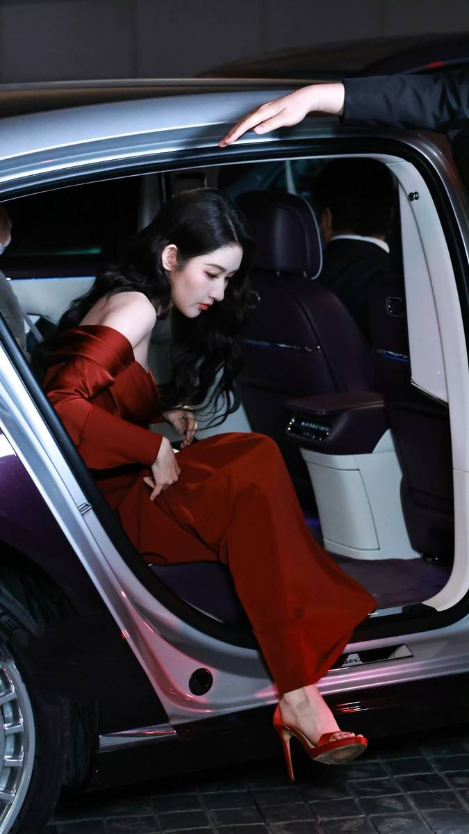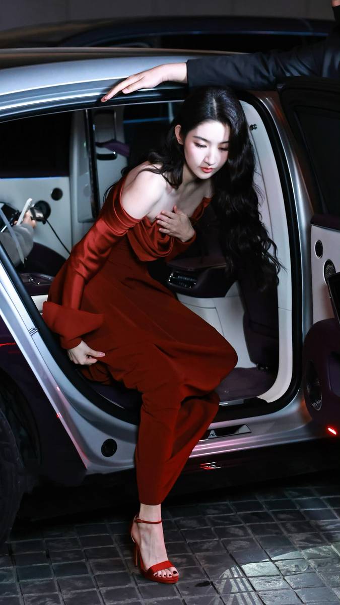 王玉雯红裙卷发下车姿态优雅 五官明艳松弛感拉满