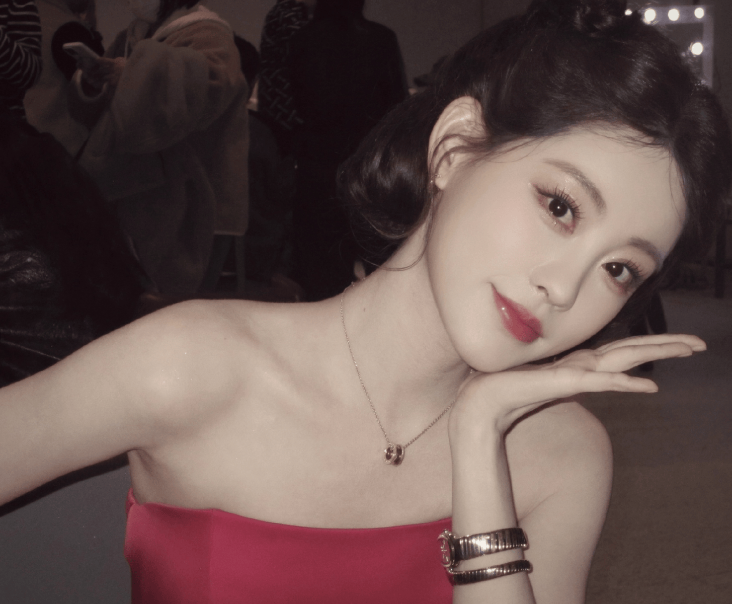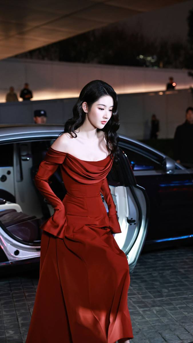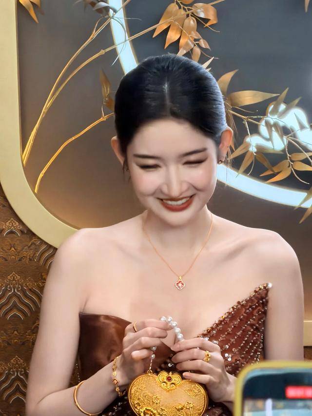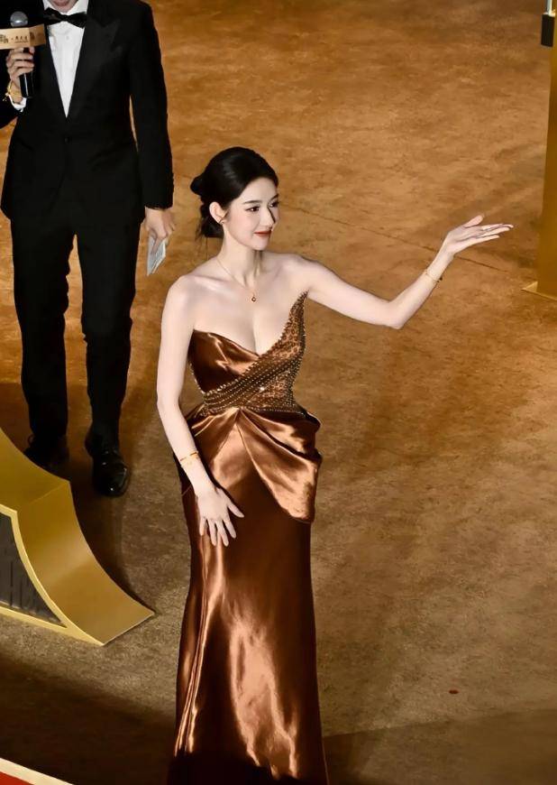 不刻意挤笑容,眼神沉静笃定,自带一种从容不迫的气场。鎏金礼裙的光泽衬得她肌肤胜雪,美得毫不张扬却自带锋芒。