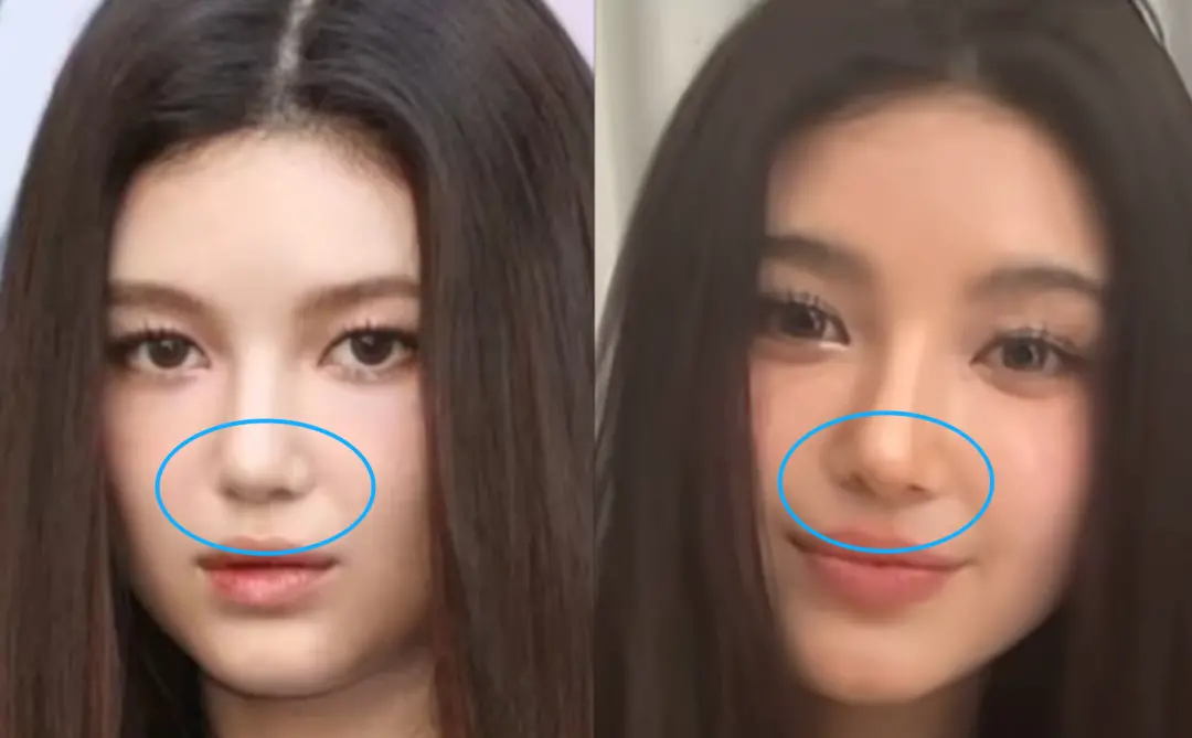 鼻子调整:出道前鼻子型高但形态不足,通过抬高高度、收窄鼻翼,视觉上拉高面中,增强混血感;