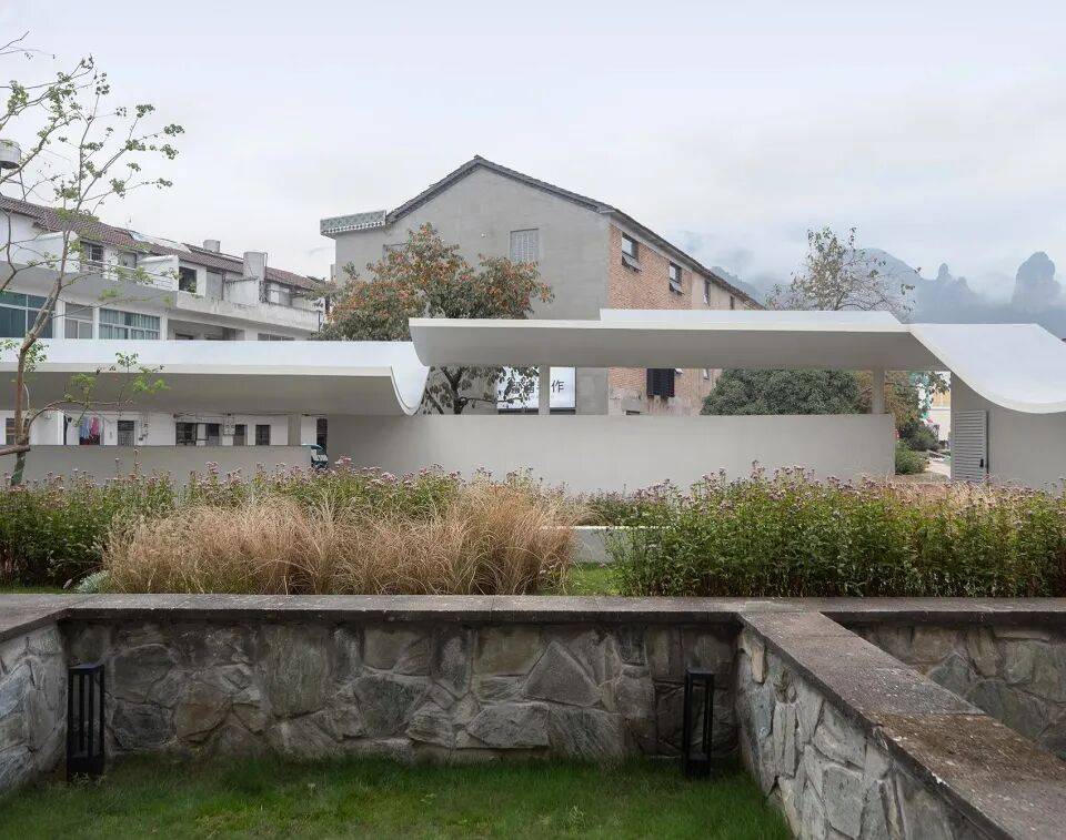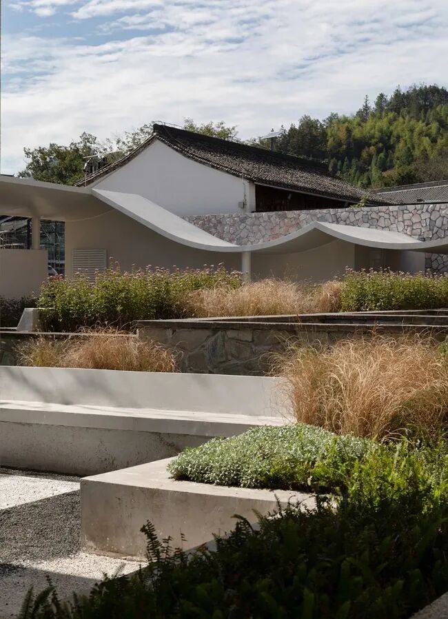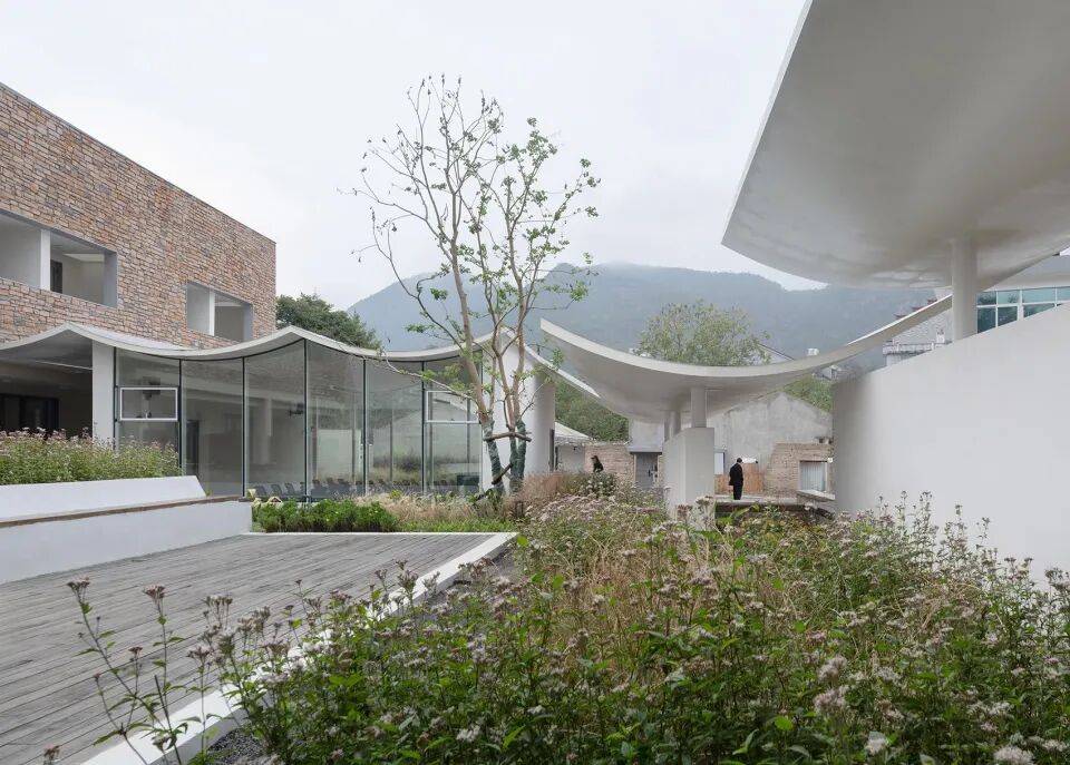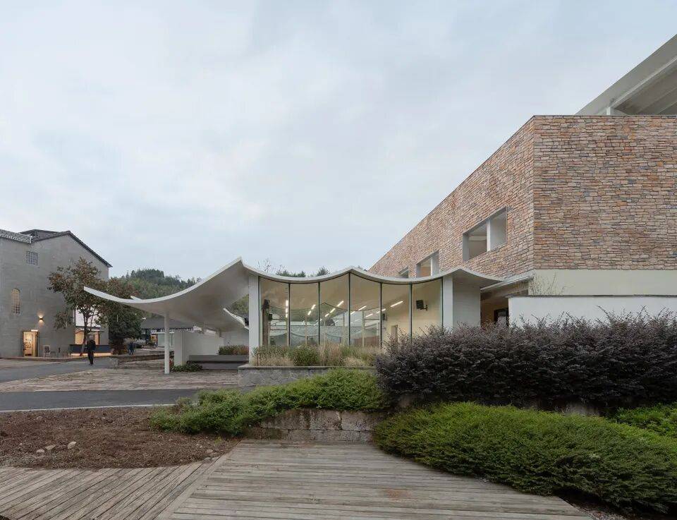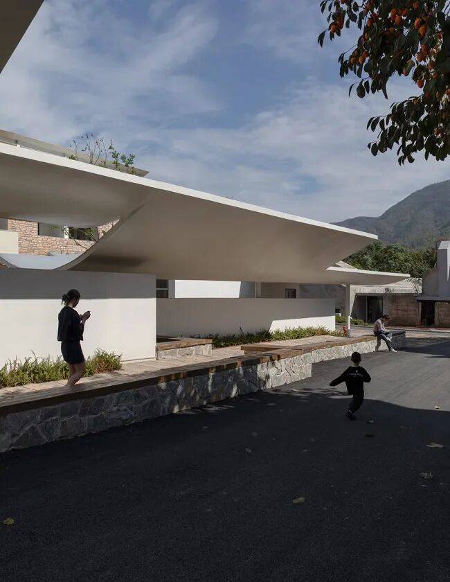原址活化:保留原王户小学的夯土墙、坡屋顶结构,通过穿插白色几何体块形成新旧对话,延续村落肌理。