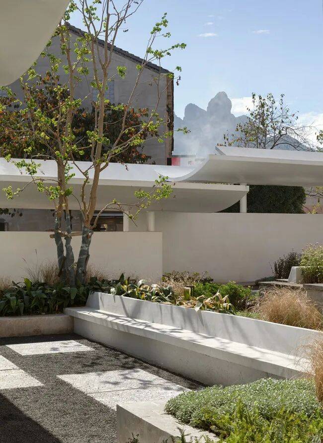 自然材料:芭蕉树、松树、蕨类、青苔,软化建筑边界。