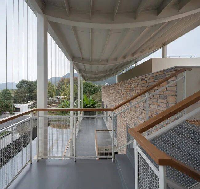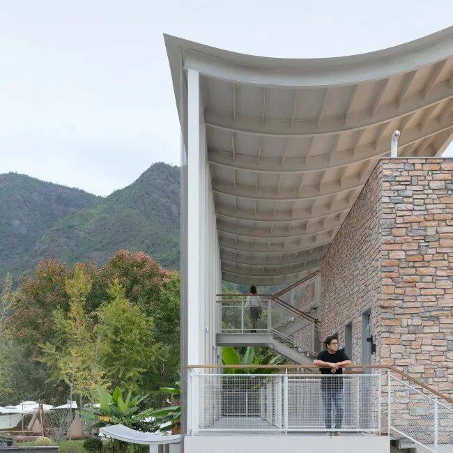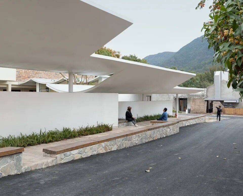 轻薄而漂浮的反曲钢结构屋顶下,高低错落的片墙间,铺上村落各地收集来的老石板,厚实的木头放置在乱石堆砌的矮墙上形成座椅,蕨类和青苔杂植其间。村里晒太阳的老人、干活聊天的女人和游客、来写生的学生、这些陌生新村民都聚在廊下,熟悉和陌生在此处同时铺陈展开,形成通往写生基地多功能厅的独立次入口。三岔路口空间、视线得以打开,沿复廊拾级而上,可以通往村民广场走向村落深处。