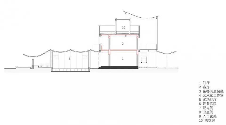 洄游路径:从北面水院进入,经外廊、内庭院、多功能厅,最终抵达屋顶露台,形成“远-高-深”的借景序列,如同一幅展开的吴冠中画作;