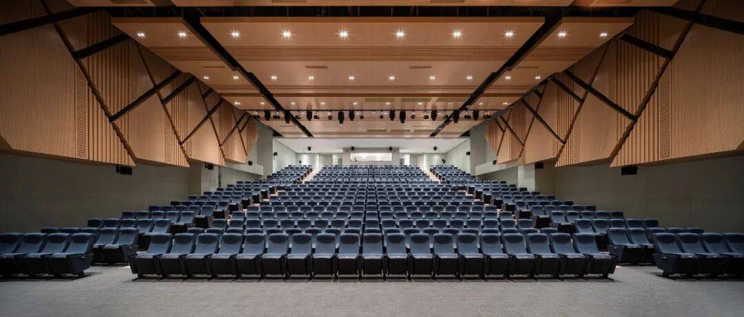 中庭报告厅:木色与淡蓝色为主调,照明系统支持会议、休息、清洁模式,演讲者视觉舒适度经UGR测算;