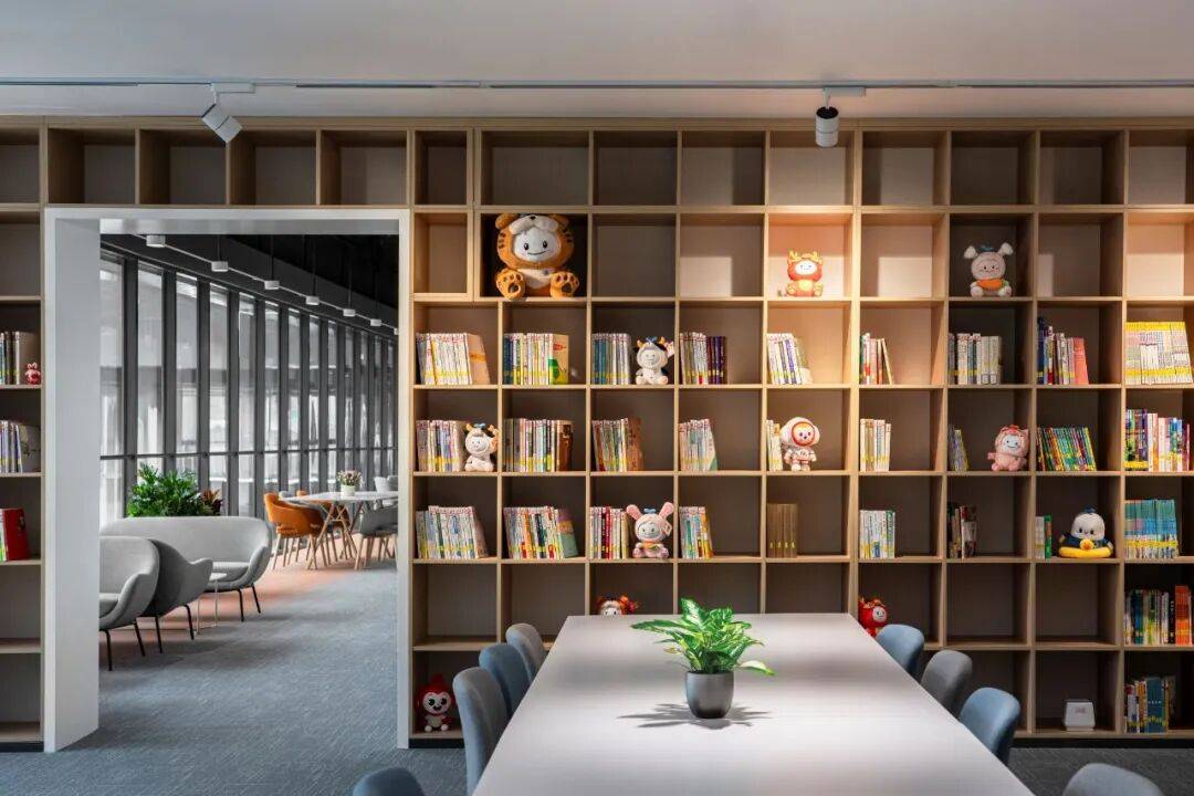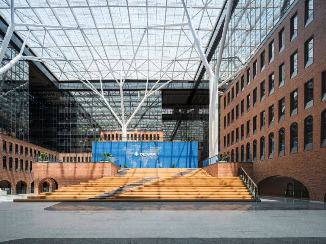 “学院气质”营造:以红砖、拱圈、木色与淡蓝色为主调,通过好未来广场、中庭报告厅、阅览区等空间,构建“教育基石”的象征体系;