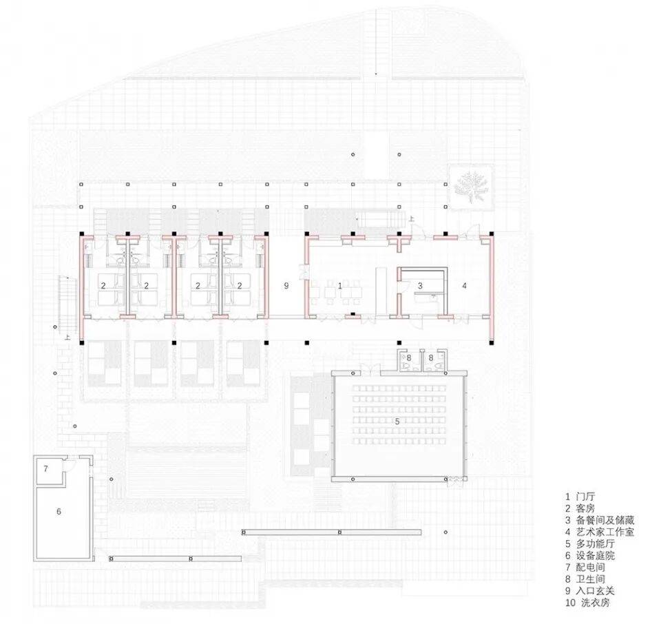 青艺宿地作为给青年艺术家、学生的写生、交流基地,除了提供方便写生的住宿单元之外,还希望可以有丰富的空间,促进彼此交流讨论和学习。而原小学建筑是砖混结构,层高和开间都受到了很大的限制,我们设计在原有的建筑体量东南侧加入一个小型多功能交流厅,和原村民之家(本项目建成过程中,村民之家已改为仙景村村咖和餐厅运营)的多功能厅形成联动,可供师生进行写生交流和书画联展。