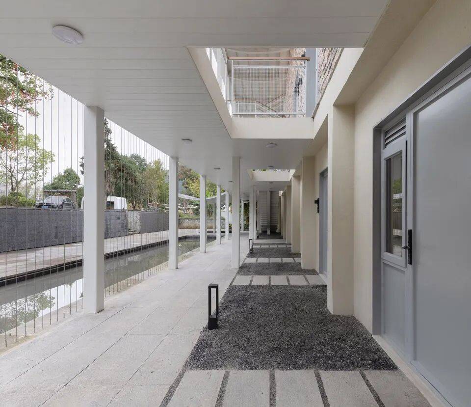 入住青艺宿地的客人,从北面水院进入场域后,跨过水院沿着北面的外廊抵达首层中间跨——这里原是小学的楼梯间——设计保留了它的开放性,作为进入门厅的室外序厅。