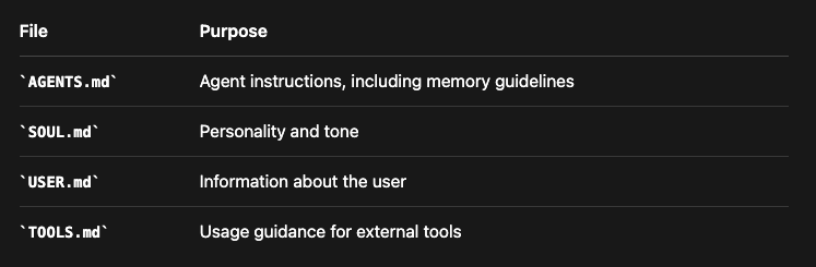 这些文件跟记忆文件一块待在AI智能体的工作区里,这就让整个AI智能体的配置变得完全透明,而且你想改就改。