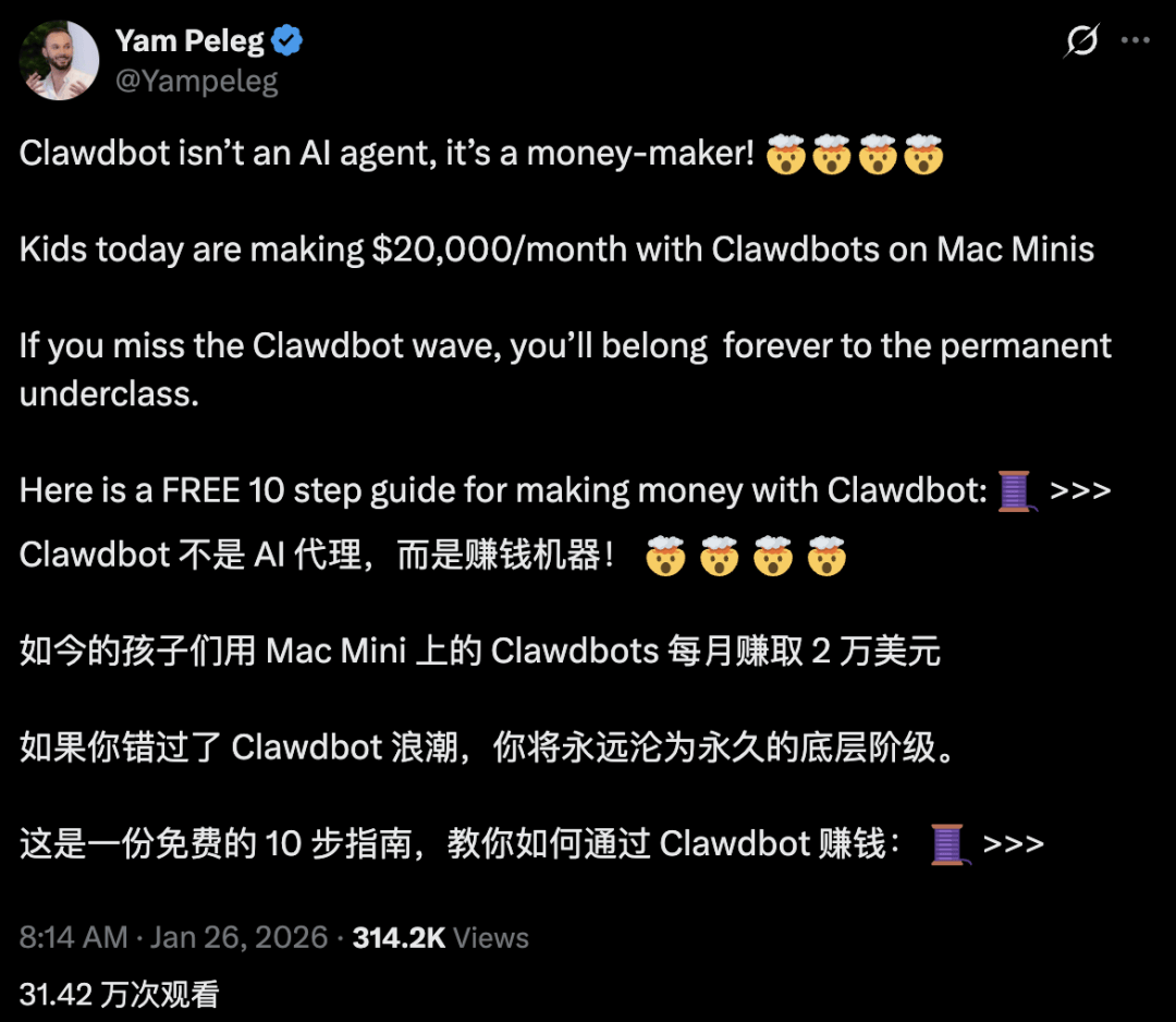 甚至,还有人把Clawdbot当成了赚钱工具,开始兜售Clawdbot赚钱指南,还不忘贩卖一波焦虑:
