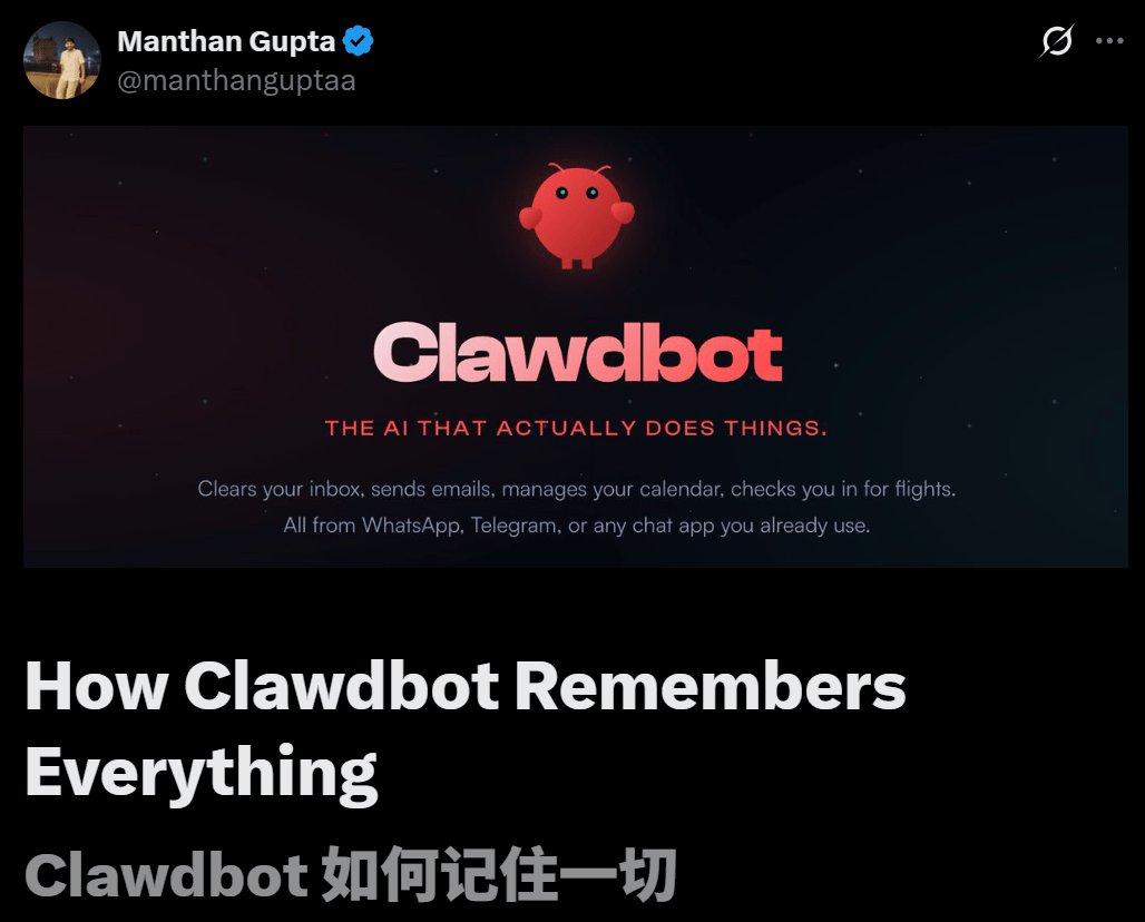 他在「Clawdbot如何记住一切」一文中详细复盘了Clawdbot独特的记忆机制原理。