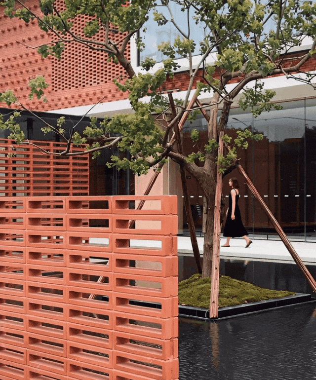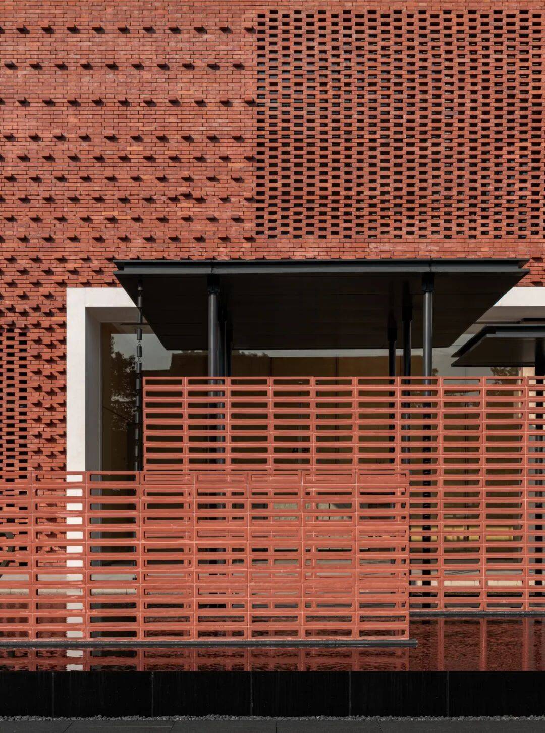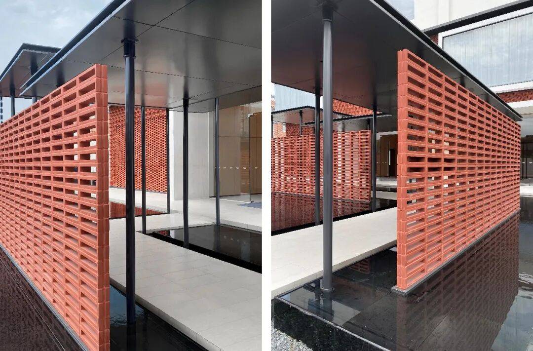 曲折的连廊刻意拉长了行进路径,连廊的挑檐与格栅组合,既延续了岭南建筑“遮荫避雨” 的智慧,又让光线柔和渗入,来访者在缓慢移动中,掠过红砖,穿过树影,临过池边,放松心态,逐渐进入“与光对话” 的沉浸状态。