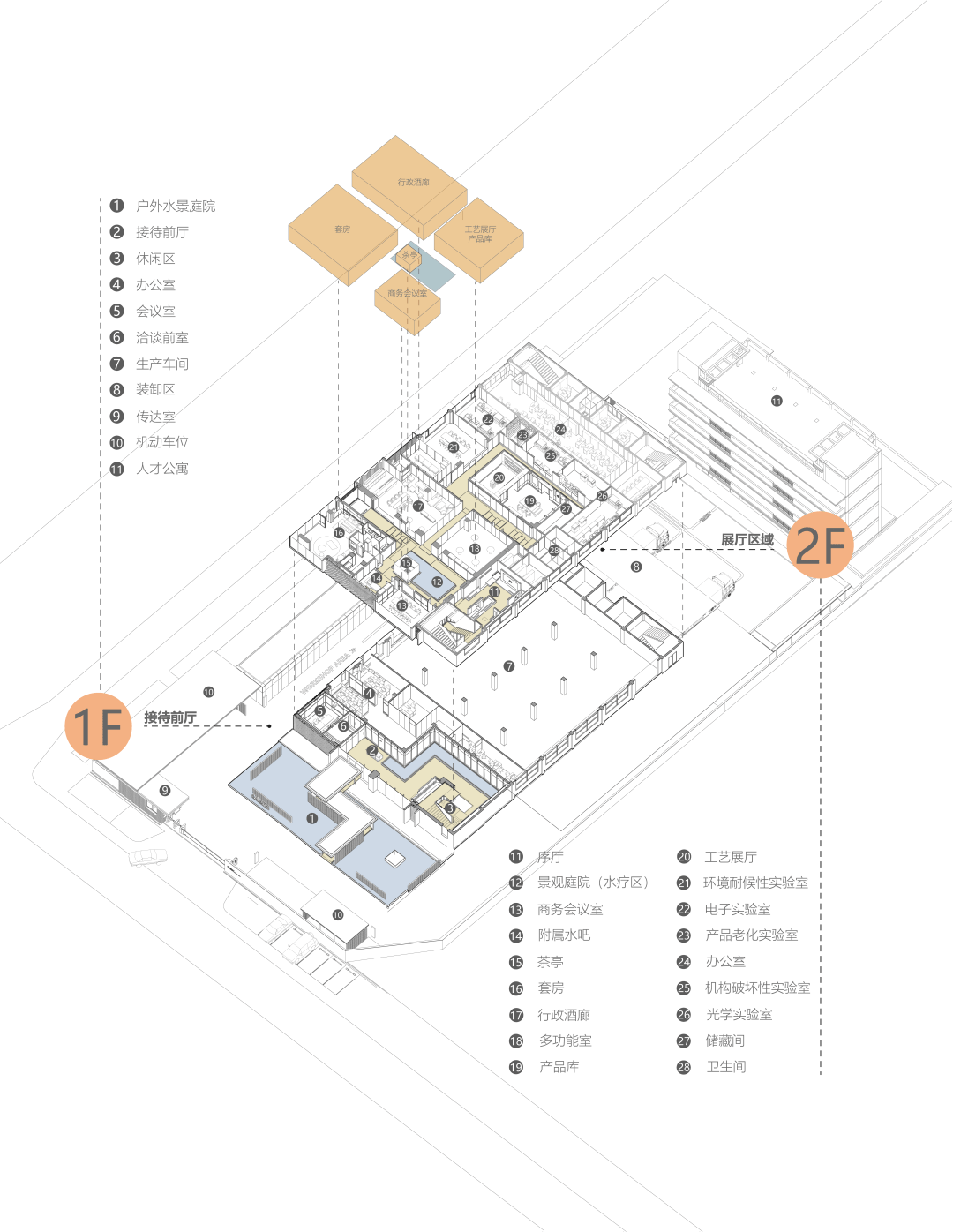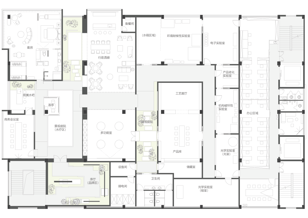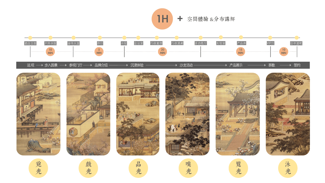 传统工厂追求生产效率,动线设计往往是直线式的“两点一线”。而艾罗创新工厂反其道而行之,采用迂回曲折的动线布局,刻意拉长行进路径。这种“慢设计”策略,灵感源自《清十二月令图》,旨在让来访者从城市喧嚣中抽离,完成从“工业场景”到“体验空间”的心理过渡,使“光的体验”在进入建筑前便悄然开启。整个动线遵循“远观→步入园景→参观门厅→品牌介绍→沉浸体验→沙龙活动→重点展示→签约→茶歇”的完整链路,对应“览光、觅光、戏光、品光、嗅光、沐光”六个体验阶段,让来访者在迂回中不断邂逅光的不同形态。