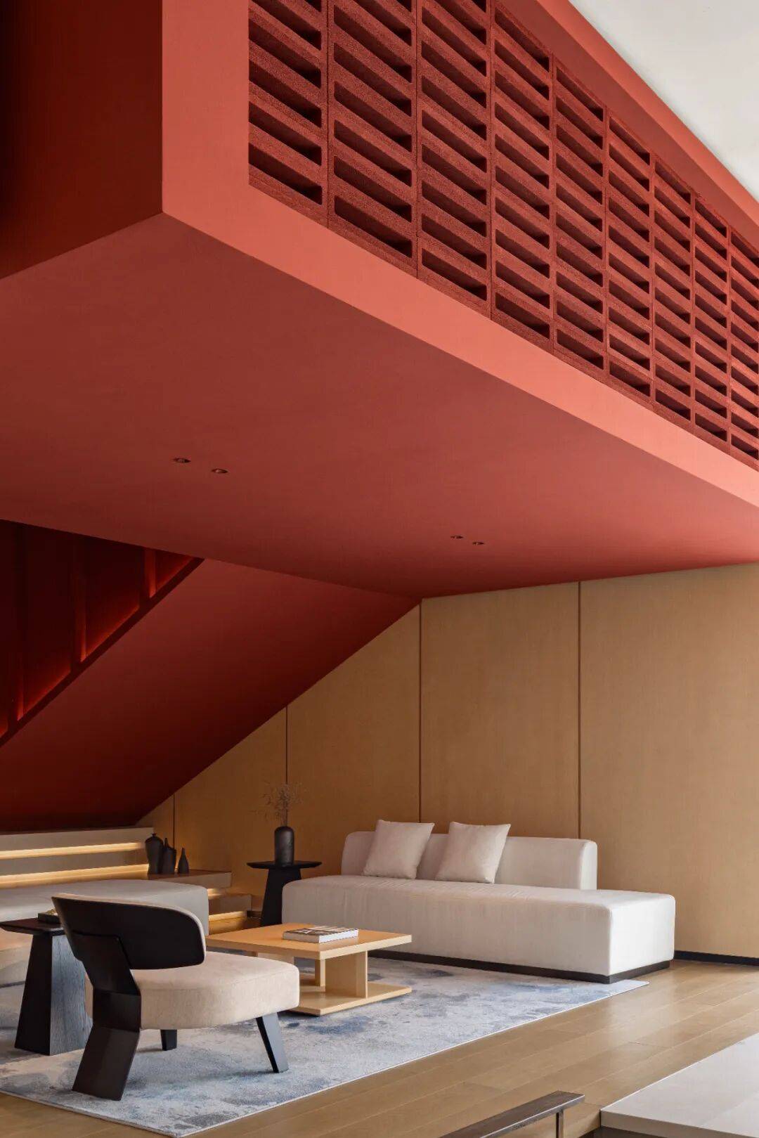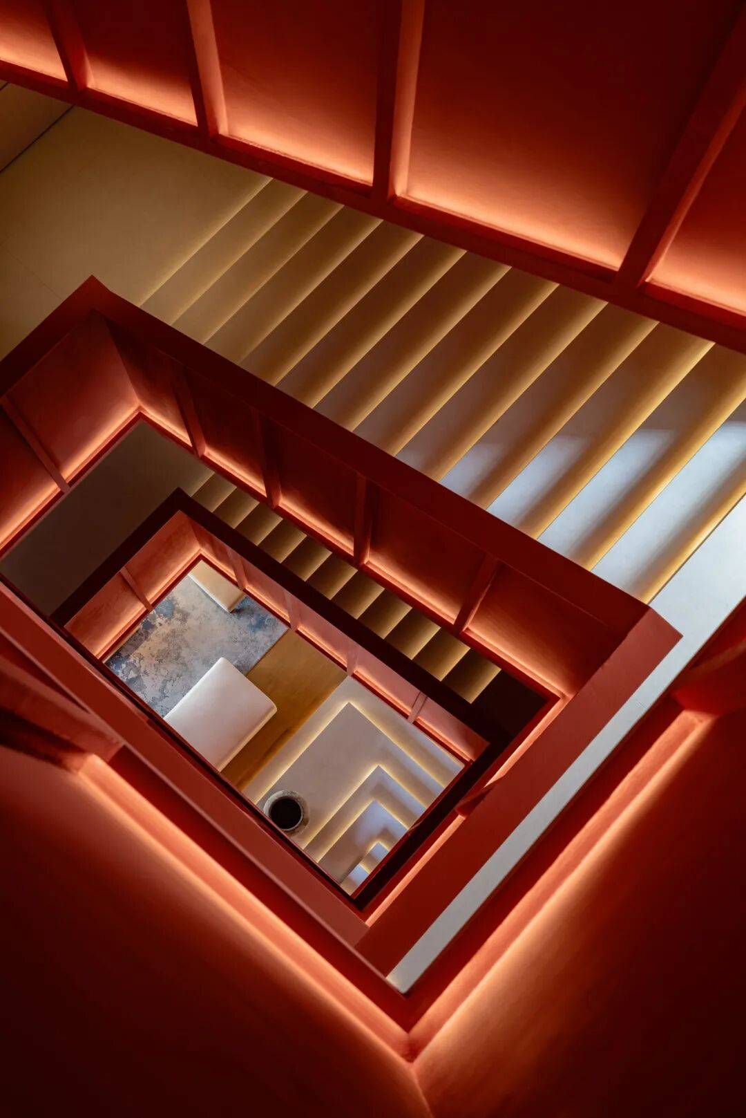 当动线行至庭院深处,一条极具雕塑感的红色楼梯成为空间叙事的“转折点”—— 螺旋上升的形态不仅强化了垂直交通的引导性,色彩上也对艾罗主题品牌色调产生了强烈的呼应。