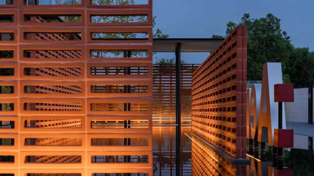 来访者从主入口步入,首先遇到的是由空心砖砌筑的“光影屏风”——作为入口与建筑主体的过渡,它起到了空间缓冲的作用;作为“光” 设计的第一个“舞台”,白天,阳光穿透空心砖的孔隙,在地面投射出疏密有致的光斑。夜晚,LED 灯带透过砖缝勾勒出屏风的轮廓,形成“光的剪纸” 效果,为“邂逅” 埋下伏笔。