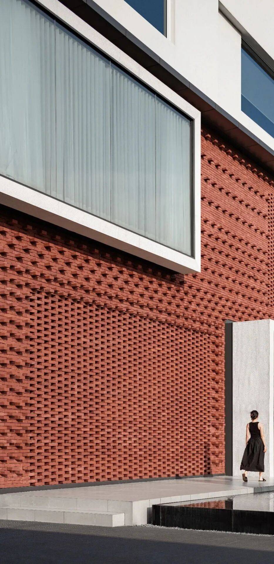 在艾罗项目中选用红砖,有着多方面的考量。从功能上,红砖透气性好、耐久性强,适配珠三角的气候特点;从品牌上,其暖色调与艾罗的品牌主色呼应,粗糙肌理传递出品牌“温暖、有温度”的核心调性,耐久性隐喻着品牌对品质的坚守;从文化上,红砖是传统建筑常用材质,承载着本土记忆,通过现代砌筑工艺赋能,成为连接传统与现代的媒介。加减智库通过砖的模数变化、不同砌筑工艺,让红砖在白天形成丰富的光斑,夜晚成为光影的载体,使这种传统材料在智能制造的空间中焕发新生。