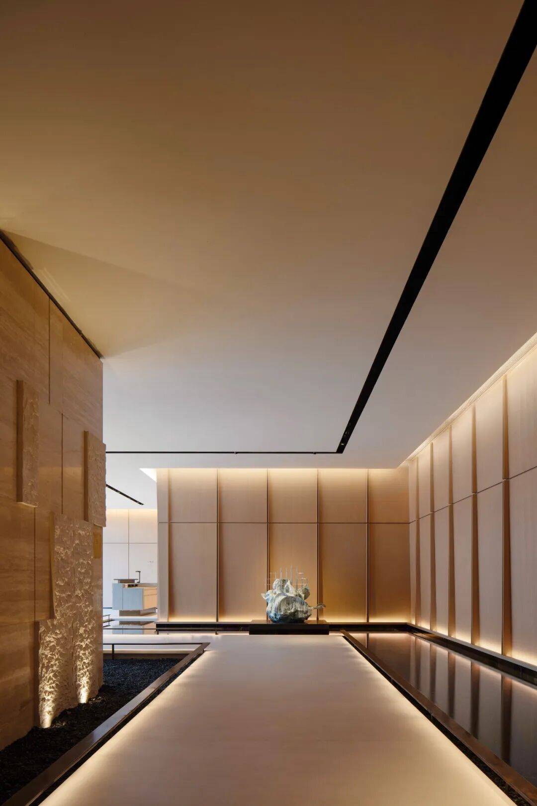 二层水院是“游园戏光” 的核心场景,也是品牌体系实力展示的关键空间。设计通过镜面水池、雾化装置与隐藏式照明的组合,构建出东方的禅境空间 。阳光在水面折射出粼粼波光,灯带与建筑倒影交织,形成“悬浮的光盒”。