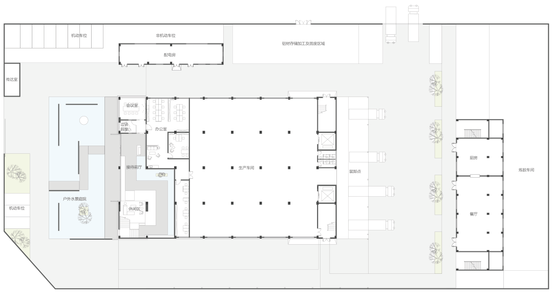 传统工厂的动线设计追求生产效率,往往是直线式的“两点一线”,而我们反其道而行之,采用迂回曲折的动线布局,刻意拉长行进路径。这种“慢设计” 策略,核心是为了让来访者从城市喧嚣中抽离,完成从“工业场景” 到“体验空间” 的心理过渡,让“光的体验” 在进入建筑前便已悄然开启。
