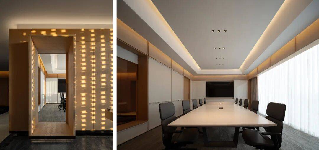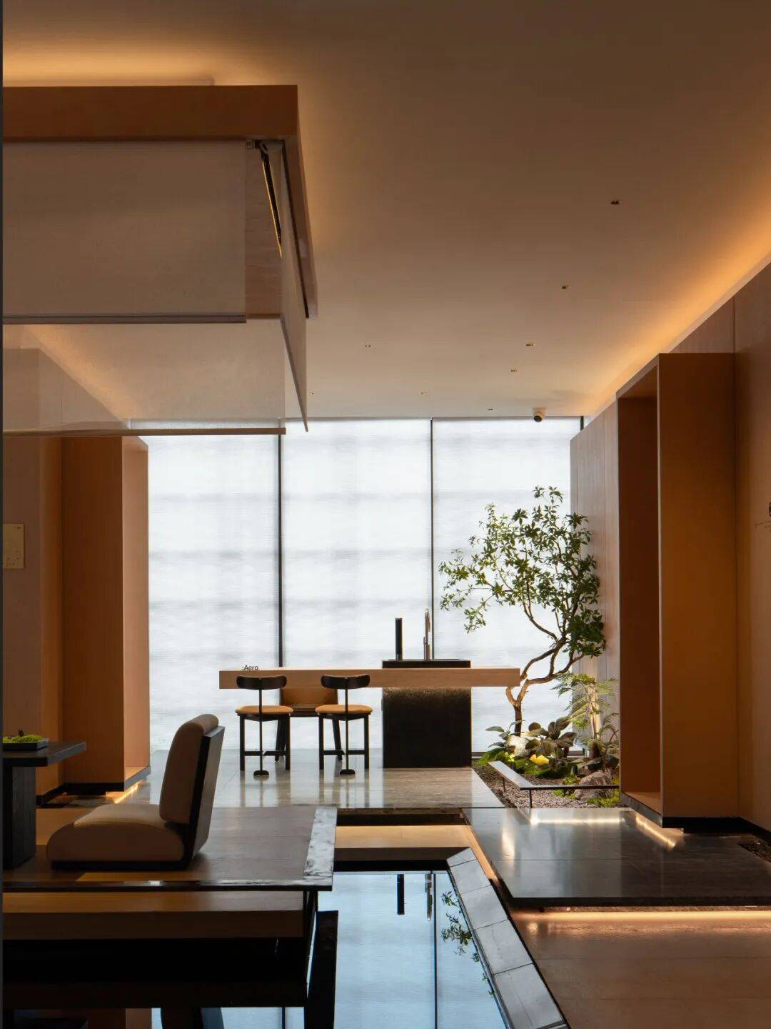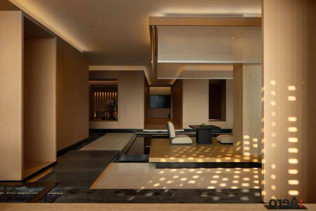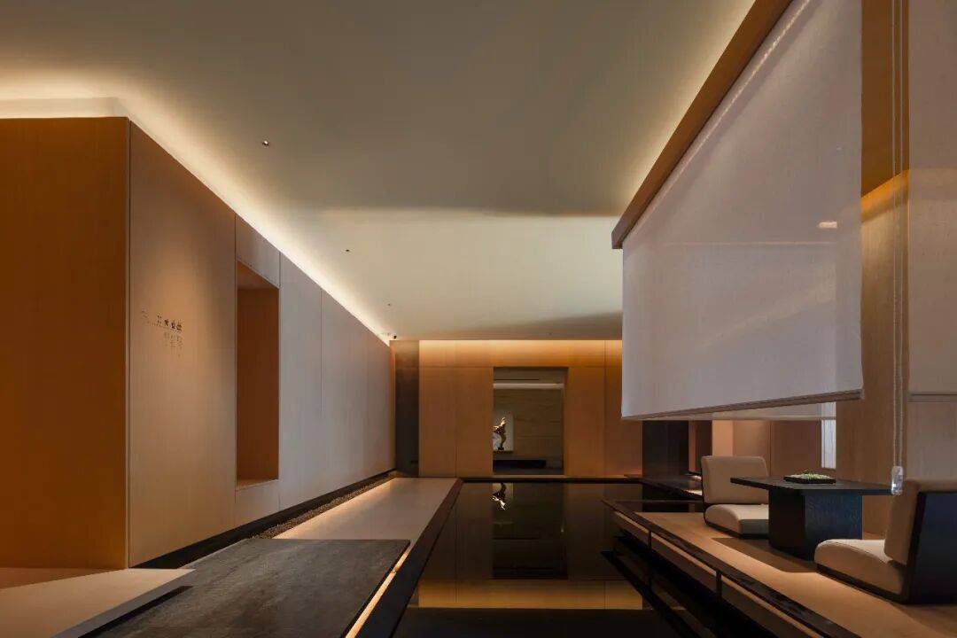 二层水院是“游园戏光”的核心场景,也是品牌体系实力展示的关键空间。设计通过镜面水池、雾化装置与隐藏式照明的组合,构建出东方的禅境空间。水院的灯光系统与艾罗的智能照明产品联动,来访者可通过 APP 一键切换不同灯光情景模式,充分体验人因与节律照明的多维变化。为了强化沉浸感,水院周边植入香氛系统,雪松与檀香的气味随水雾弥漫,配合潺潺水声,形成“视觉 - 听觉 - 嗅觉”的通感体验。围绕水院布局的“微缩光影剧场”,包括商务会议、行政酒廊、度假客房、商务宴会等功能空间,与办公功能深度融合,传递出松弛感,让商务活动在写意自在的氛围中自然发生。