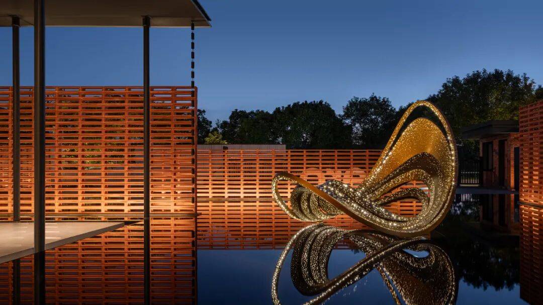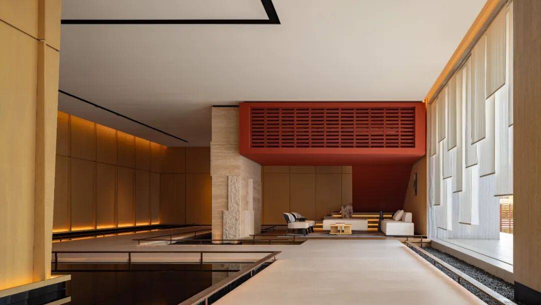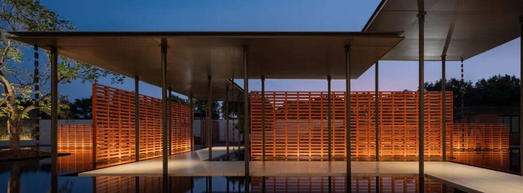 通过红墙的限定,趟过水上的栈道进入室内接待大厅,庭院的水景连接到室内,成为一个无界的整体,微微倾斜的木饰面墙体随着曲折蜿蜒的步道倒影在水中。灯光从水下向上漫射,照亮木饰面的纹理,让墙体仿佛“悬浮于水面”,进一步强化了空间的轻盈感。低矮的凭栏照亮了漂浮水上的栈道,引导着人们追随着灯光继续探索游园。