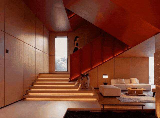 通过红墙限定,趟过水上栈道进入室内接待大厅,庭院水景连接到室内成为无界整体。微微倾斜的木饰面墙体倒影在水中,灯光从水下向上漫射,照亮木饰面纹理,让墙体仿佛“悬浮于水面”,强化了空间的轻盈感。低矮的凭栏照亮漂浮水上的栈道,引导人们继续探索游园。当动线行至庭院深处,极具雕塑感的红色楼梯成为空间叙事的“转折点”,螺旋上升的形态强化垂直交通引导性,色彩呼应艾罗主题品牌色调。楼梯外侧板嵌入暖调灯光,与红砖外立面形成材质与色彩的双重共鸣,人们拾级而上,完成“与光邂逅”的第一重升维。