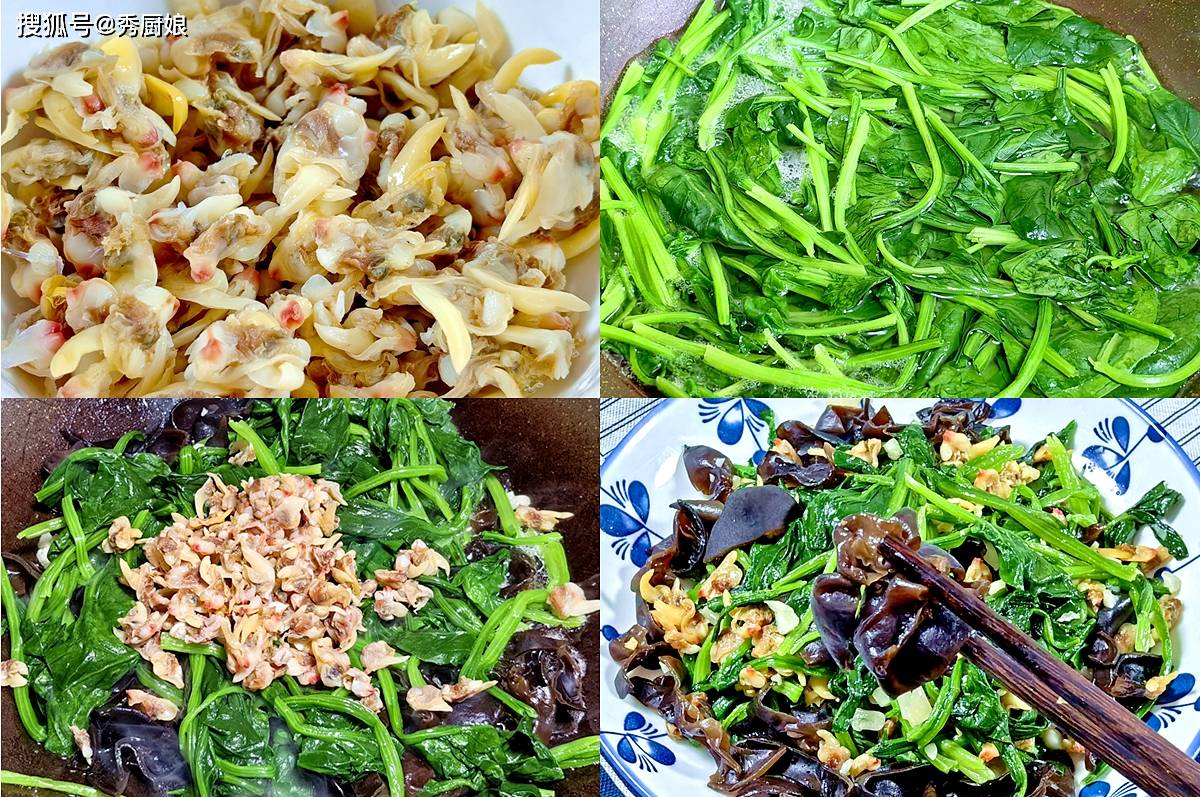 食材准备:干黑木耳一小把(泡发后约一碗),新鲜菠菜半斤,蛤蜊肉一小碗(可用新鲜蛤蜊焯水取肉),蒜末、姜丝少许,盐、生抽、食用油适量。