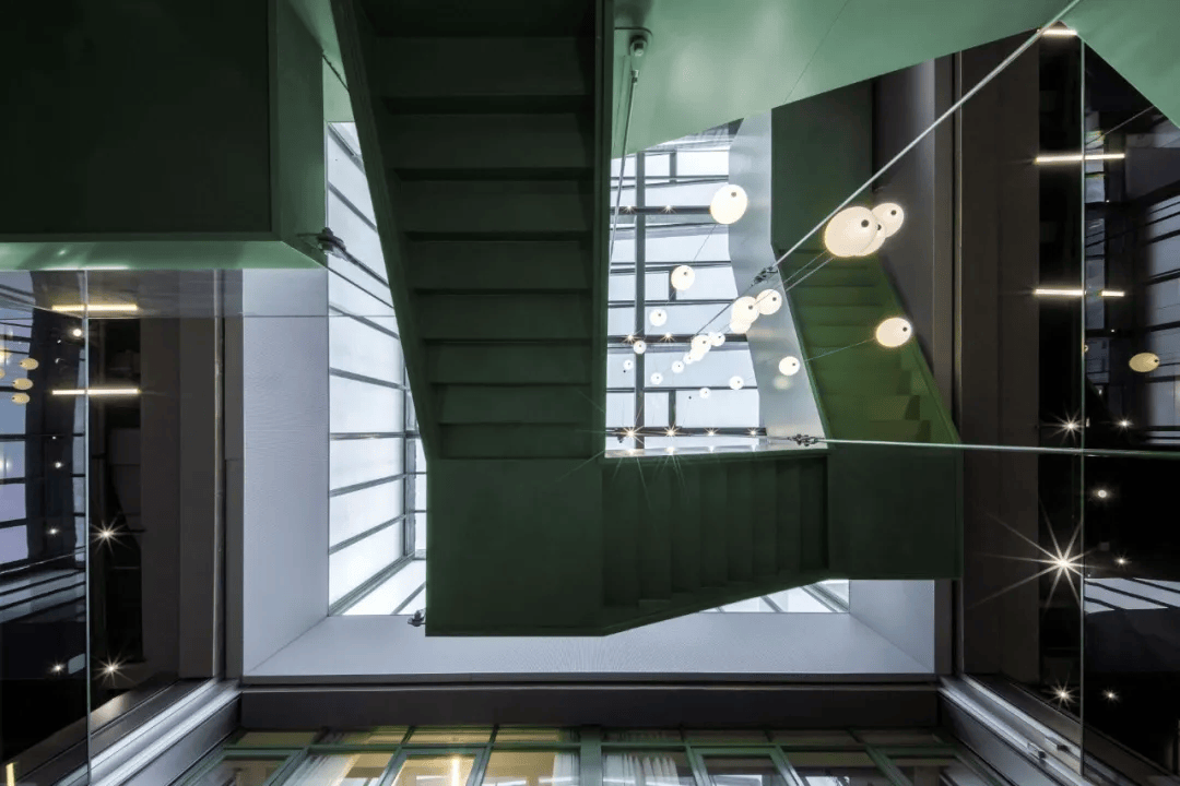 中庭核心:打通中庭,设置下挂绿色楼梯,交织自然光与垂直动线;